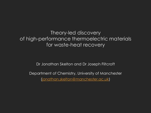 19 % 3 % 1000 MW nuclear power plant: o 650 MW waste heat o 3 % ≈ 20 MW ≈ 50,000 homes 300-500 W from exhaust gases: o 2 % lower fuel consumption o 2.4 Mt reduction in CO2 Thermoelectric generators allow waste heat to be recovered as electricity TEGs with ~3 % energy recovery (𝑍𝑇 = 1) are considered industrially viable 1. Provisional UK greenhouse gas emissions national statistics (published March 2022) 2. EPSRC Thermoelectric Network Roadmap (2018) Dr J. M. Skelton and Dr J. M. Flitcroft University of Warwick, 21st June 2024 | Slide 2
