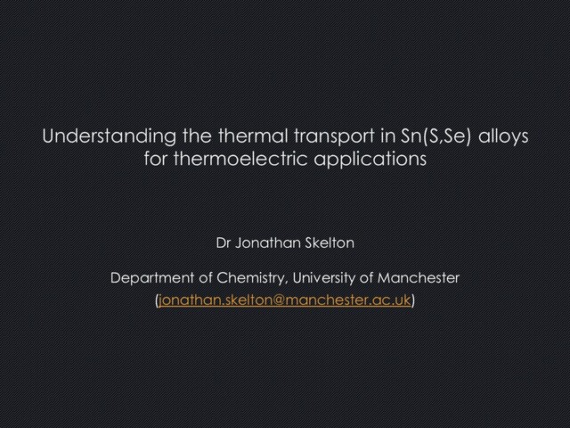accurate predictions and useful insight into how the 𝜅latt of thermoelectric materials “works” The CRTA model separates the 𝜅latt of a material into harmonic (heat capacity/group velocity) and anharmonic (lifetime) components, and may be a useful metric for comparing different TE materials The 𝜅latt of SnS and SnSe are a balance of smaller group velocities and longer lifetimes in the selenide A theoretical model for the Snm (S1-x Sex )n system suggests: o close to ideal mixing behaviour; o volume variation in accordance with Vegard’s law; and o a predictable variation in the bandgap of Sn(S1-x Sex )2 with composition, covering the Shockley–Queisser limit Calculations predict a 40-60 % reduction in the 𝜅latt of the Sn(S0.1875 Se0.8125 ) compared to SnSe, which can be ascribed mainly to a “smearing” of the phonon dispersion and a consequent reduction in the mode group velocities Dr Jonathan Skelton MISE Finale Workshop June 2021 | Slide 23