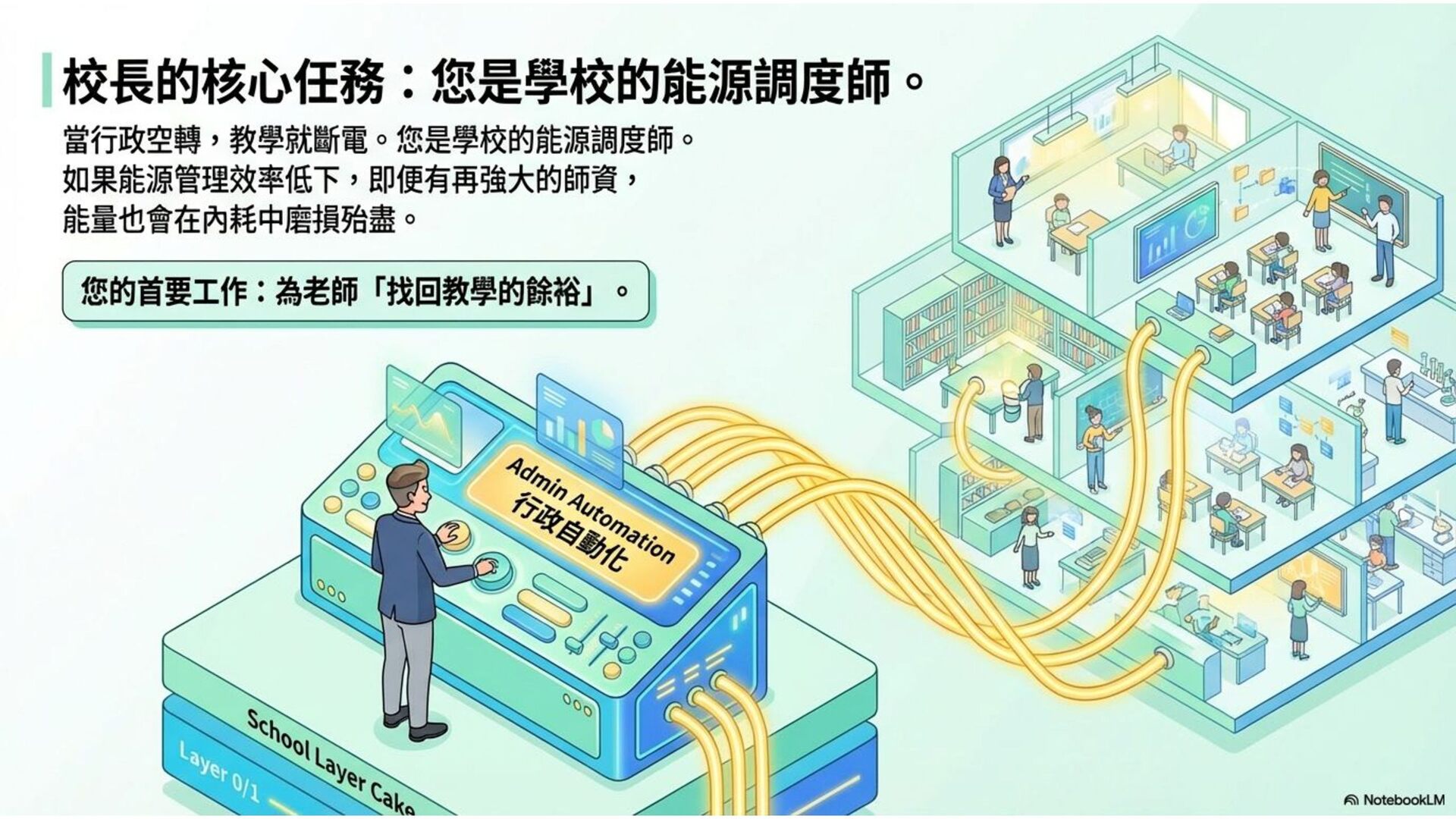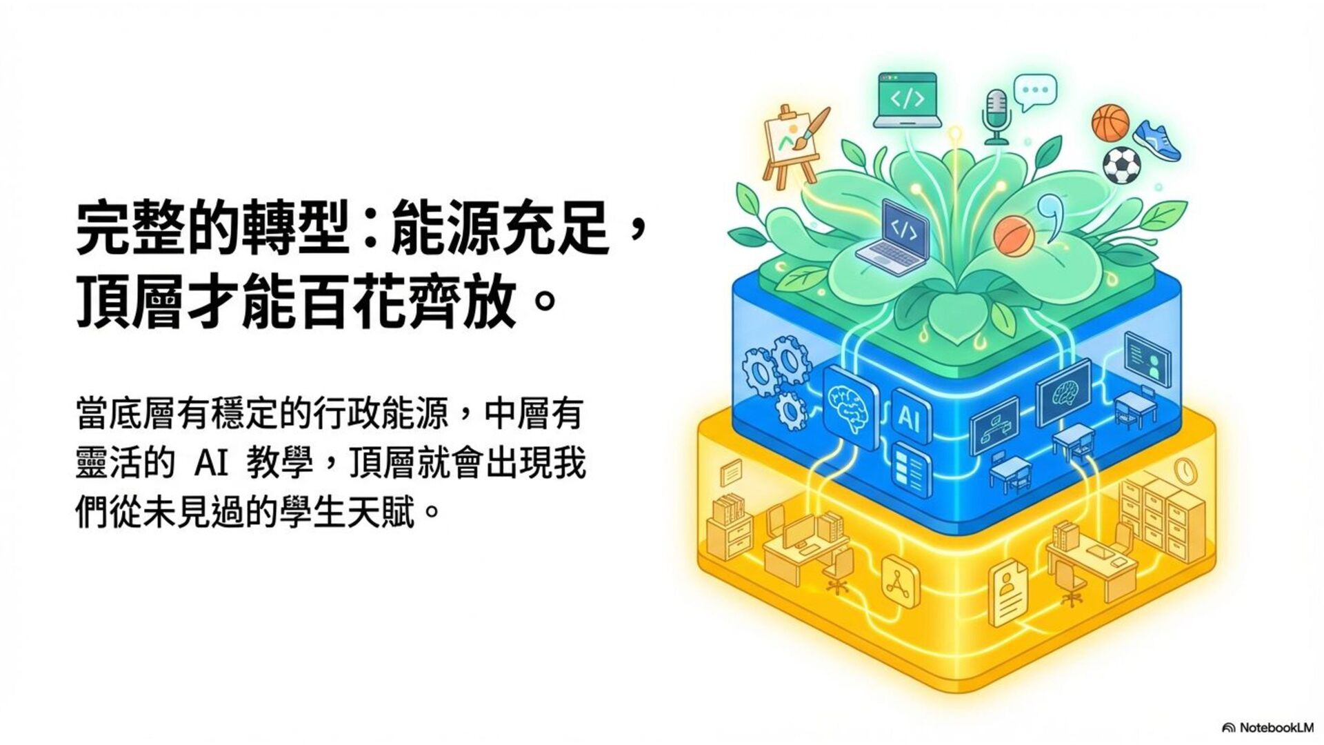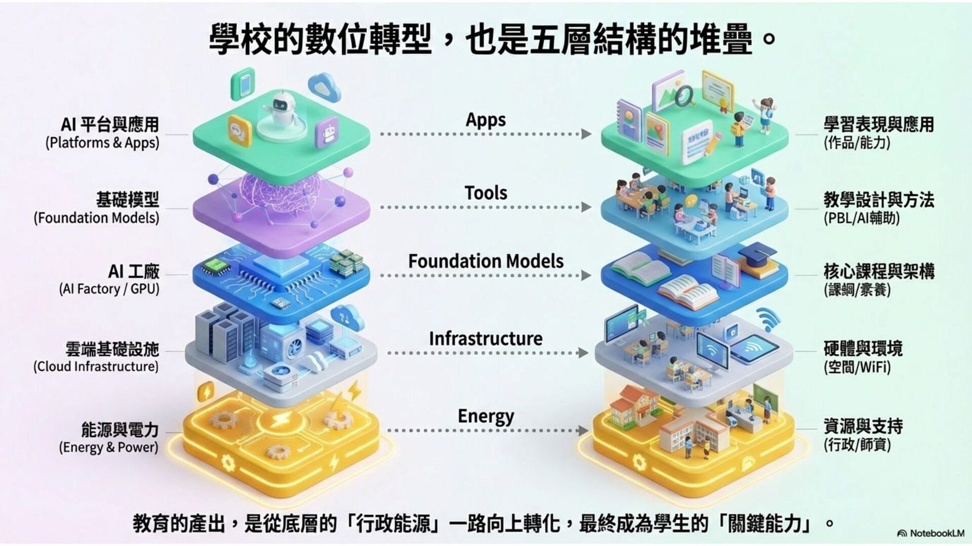 一場K12校園的AI革命,該如何由上而下的帶動轉型的齒輪。校園行政的管理者需要有「鳥瞰」全局的視野。以黃仁勳 (Jenson Huang) 的AI五層蛋糕理論對照到校園的疊床架屋、層層環扣的行政與教學改如何轉思維,應該是正在培育新一代 AI 原住民的每個教學工作者都要具備的。