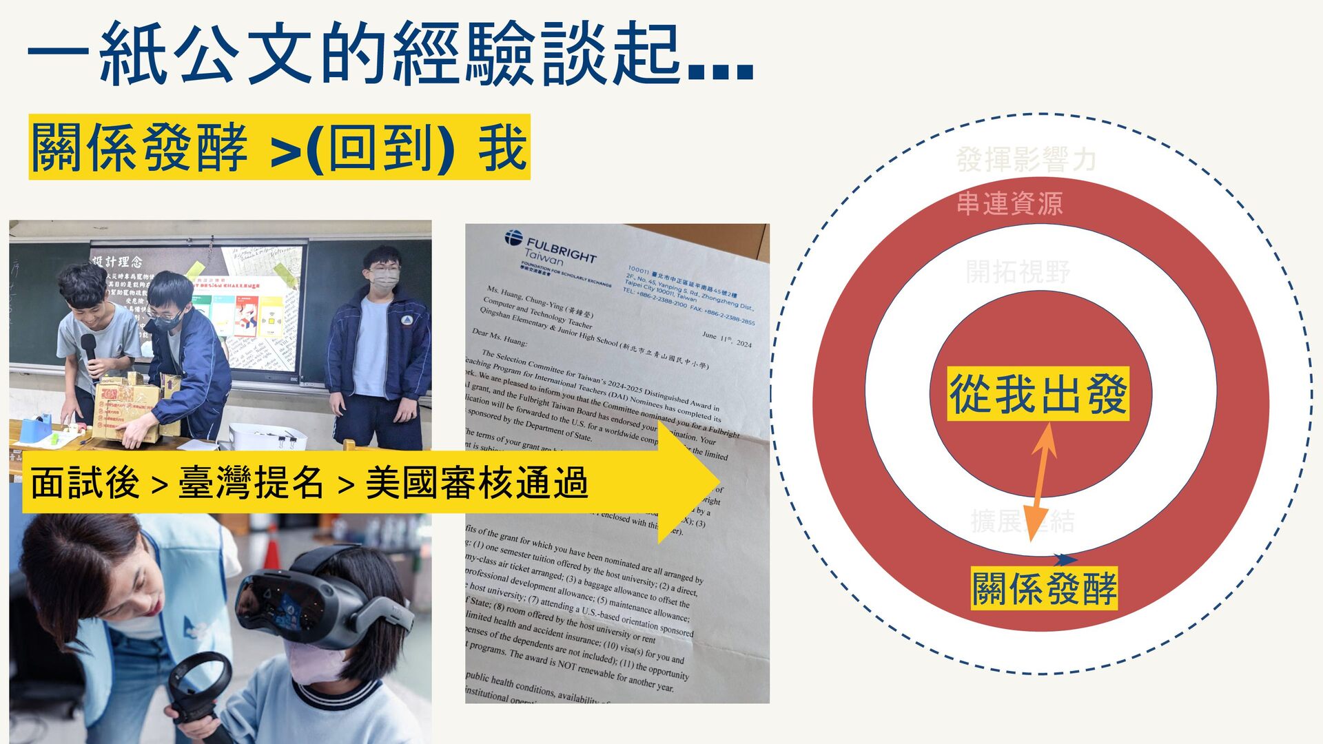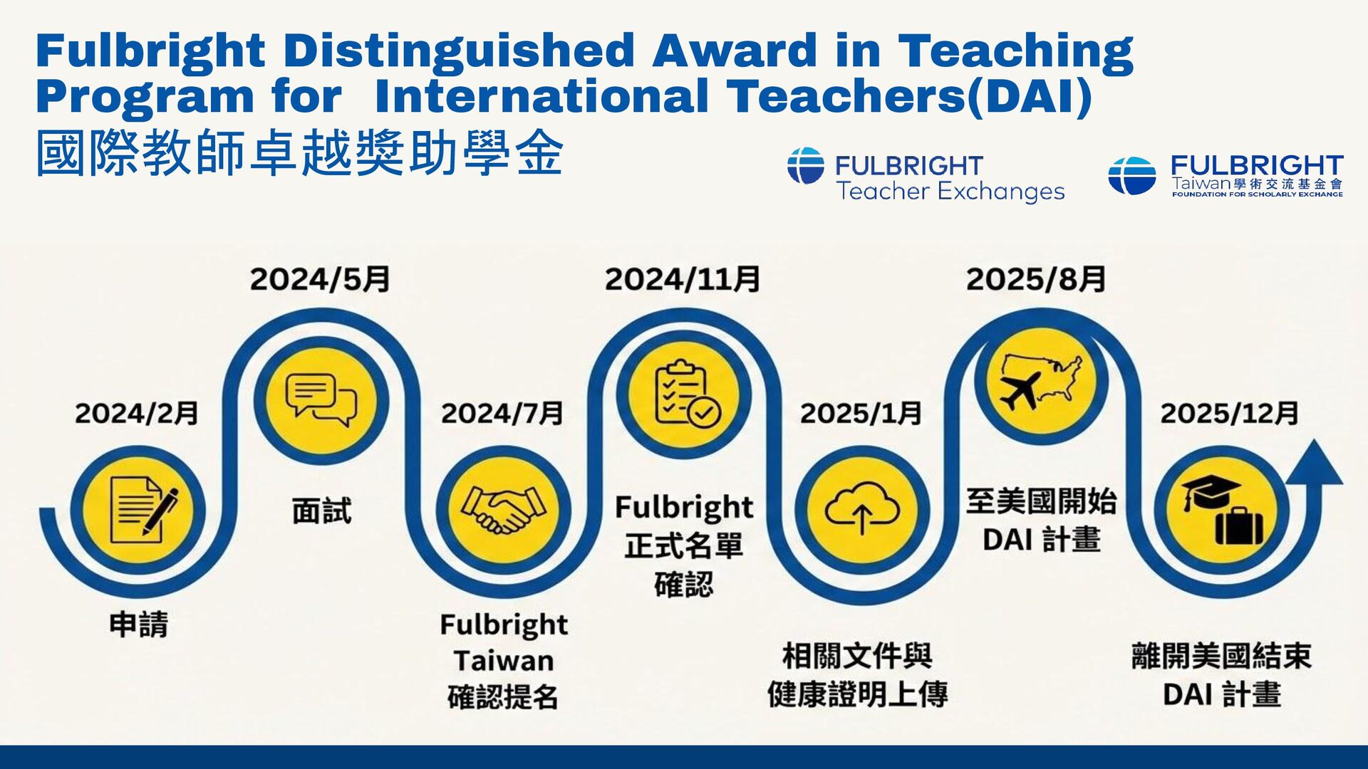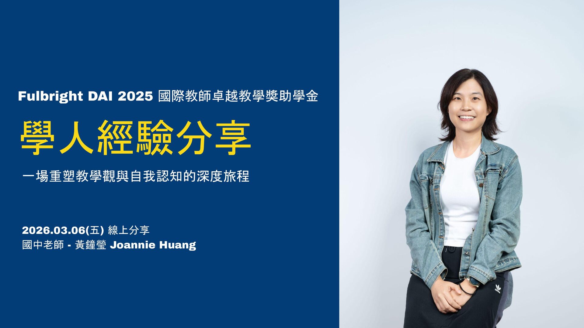 在執行完 2025年的 Fulbright Distinguished Award on teaching for International Teachers (DAI) 的計畫後,有機會在Fulbright Taiwan 舉辦的線上分享會中,分享申請與執行經驗給有興趣的老師們。