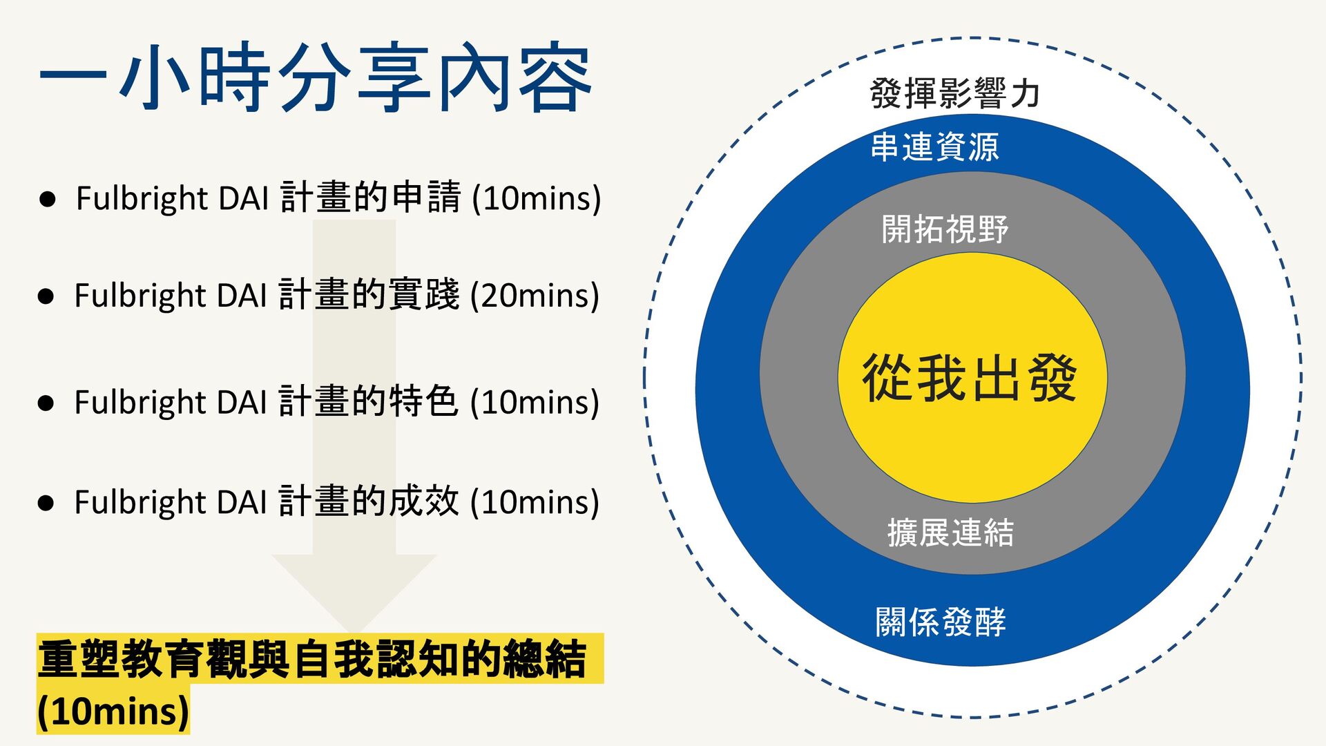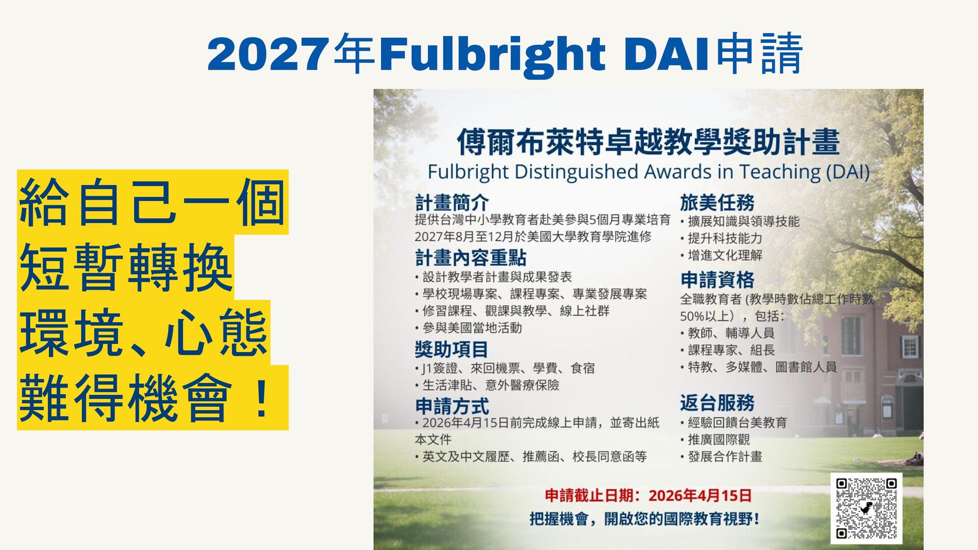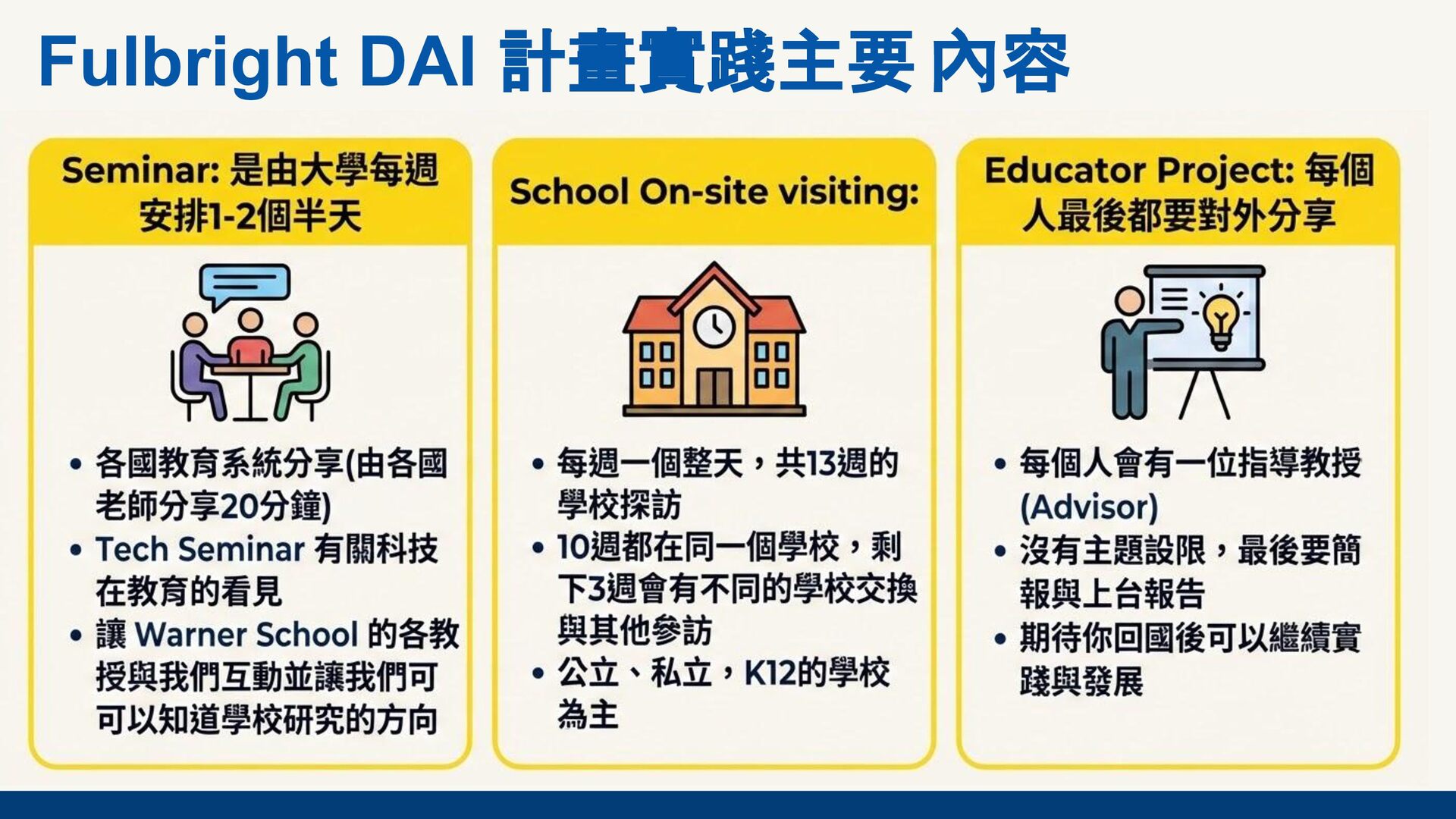 在執行完 2025年的 Fulbright Distinguished Award on teaching for International Teachers (DAI) 的計畫後,有機會在Fulbright Taiwan 舉辦的線上分享會中,分享申請與執行經驗給有興趣的老師們。