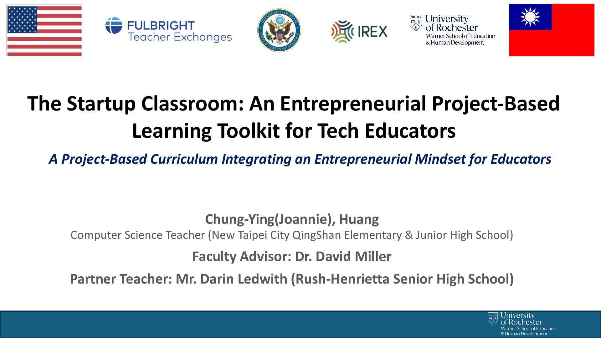 Educators Chung-Ying(Joannie), Huang Computer Science Teacher (New Taipei City QingShan Elementary & Junior High School) Faculty Advisor: Dr. David Miller Partner Teacher: Mr. Darin Ledwith (Rush-Henrietta Senior High School) A Project-Based Curriculum Integrating an Entrepreneurial Mindset for Educators