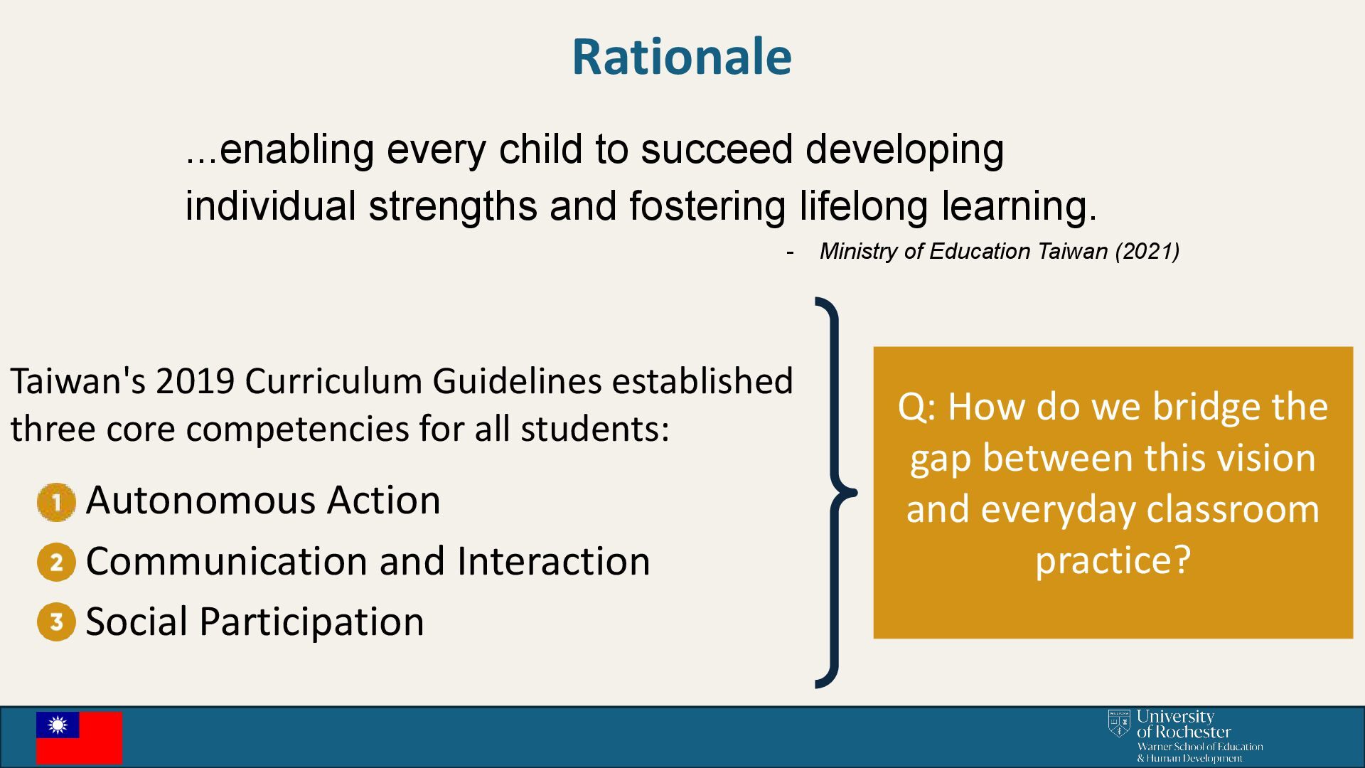 fostering lifelong learning. - Ministry of Education Taiwan (2021) Taiwan's 2019 Curriculum Guidelines established three core competencies for all students: Autonomous Action Communication and Interaction Social Participation Q: How do we bridge the gap between this vision and everyday classroom practice?