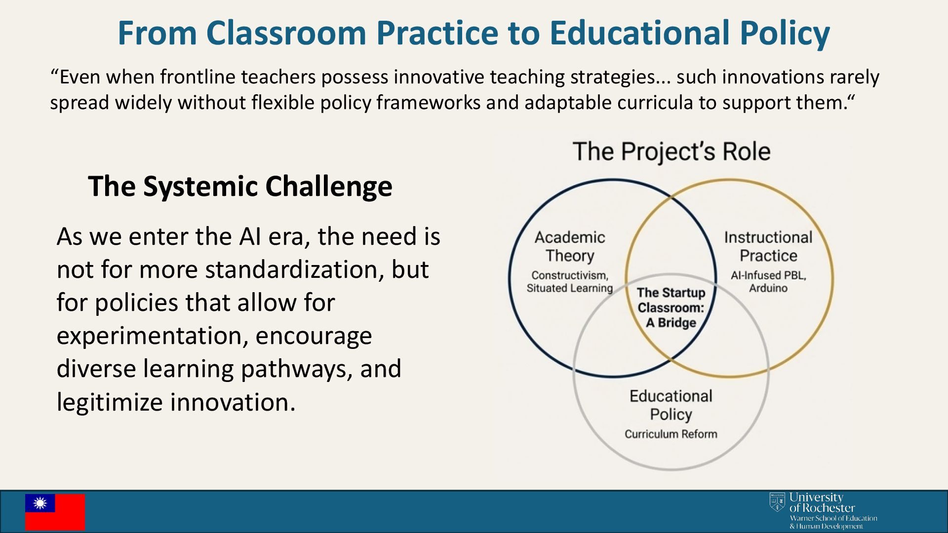 possess innovative teaching strategies... such innovations rarely spread widely without flexible policy frameworks and adaptable curricula to support them.“ The Systemic Challenge As we enter the AI era, the need is not for more standardization, but for policies that allow for experimentation, encourage diverse learning pathways, and legitimize innovation.
