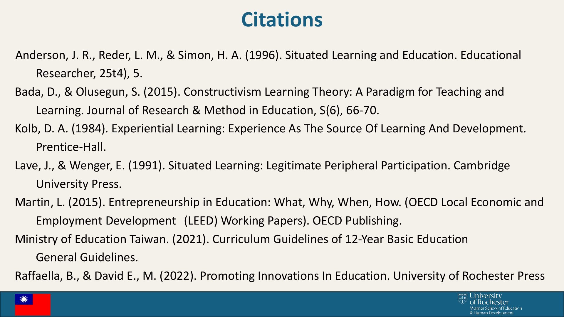 A. (1996). Situated Learning and Education. Educational Researcher, 25t4), 5. Bada, D., & Olusegun, S. (2015). Constructivism Learning Theory: A Paradigm for Teaching and Learning. Journal of Research & Method in Education, S(6), 66-70. Kolb, D. A. (1984). Experiential Learning: Experience As The Source Of Learning And Development. Prentice-Hall. Lave, J., & Wenger, E. (1991). Situated Learning: Legitimate Peripheral Participation. Cambridge University Press. Martin, L. (2015). Entrepreneurship in Education: What, Why, When, How. (OECD Local Economic and Employment Development (LEED) Working Papers). OECD Publishing. Ministry of Education Taiwan. (2021). Curriculum Guidelines of 12-Year Basic Education General Guidelines. Raffaella, B., & David E., M. (2022). Promoting Innovations In Education. University of Rochester Press