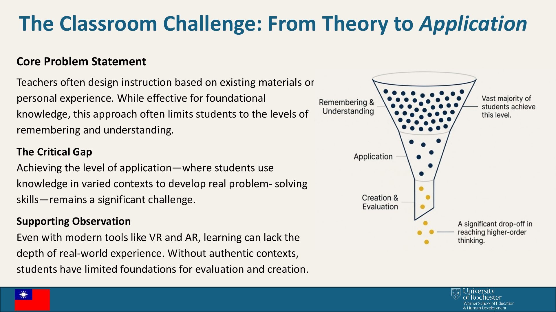Teachers often design instruction based on existing materials or personal experience. While effective for foundational knowledge, this approach often limits students to the levels of remembering and understanding. The Critical Gap Achieving the level of application—where students use knowledge in varied contexts to develop real problem- solving skills—remains a significant challenge. Supporting Observation Even with modern tools like VR and AR, learning can lack the depth of real-world experience. Without authentic contexts, students have limited foundations for evaluation and creation.