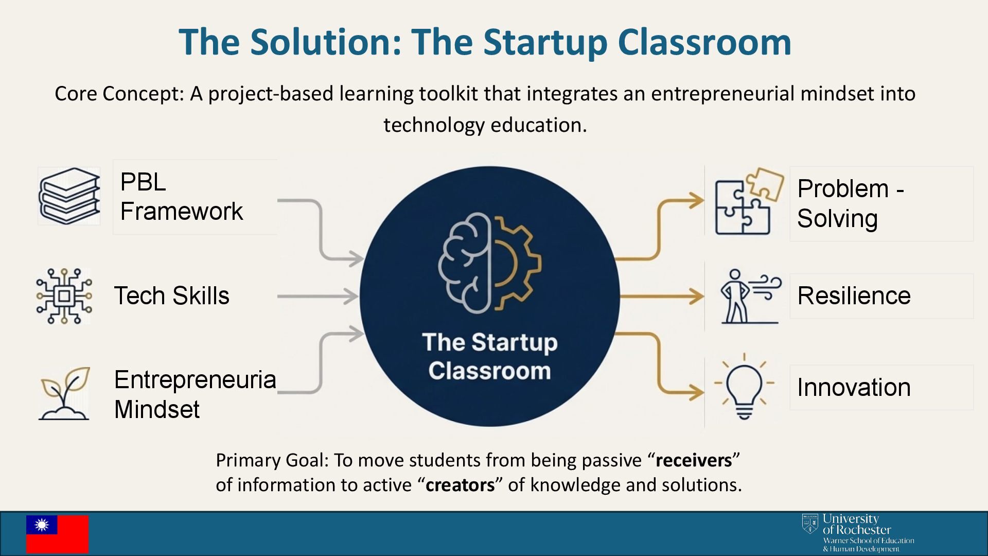 toolkit that integrates an entrepreneurial mindset into technology education. PBL Framework Tech Skills Entrepreneurial Mindset Problem - Solving Resilience Innovation Primary Goal: To move students from being passive “receivers” of information to active “creators” of knowledge and solutions.