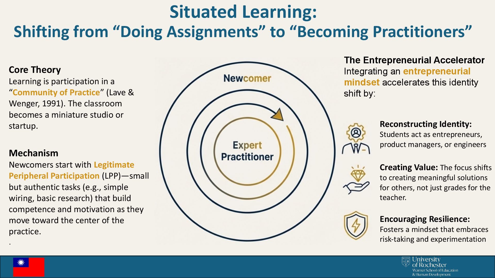 Theory Learning is participation in a “Community of Practice” (Lave & Wenger, 1991). The classroom becomes a miniature studio or startup. Mechanism Newcomers start with Legitimate Peripheral Participation (LPP)—small but authentic tasks (e.g., simple wiring, basic research) that build competence and motivation as they move toward the center of the practice. . The Entrepreneurial Accelerator Integrating an entrepreneurial mindset accelerates this identity shift by: Reconstructing Identity: Students act as entrepreneurs, product managers, or engineers Creating Value: The focus shifts to creating meaningful solutions for others, not just grades for the teacher. Encouraging Resilience: Fosters a mindset that embraces risk-taking and experimentation