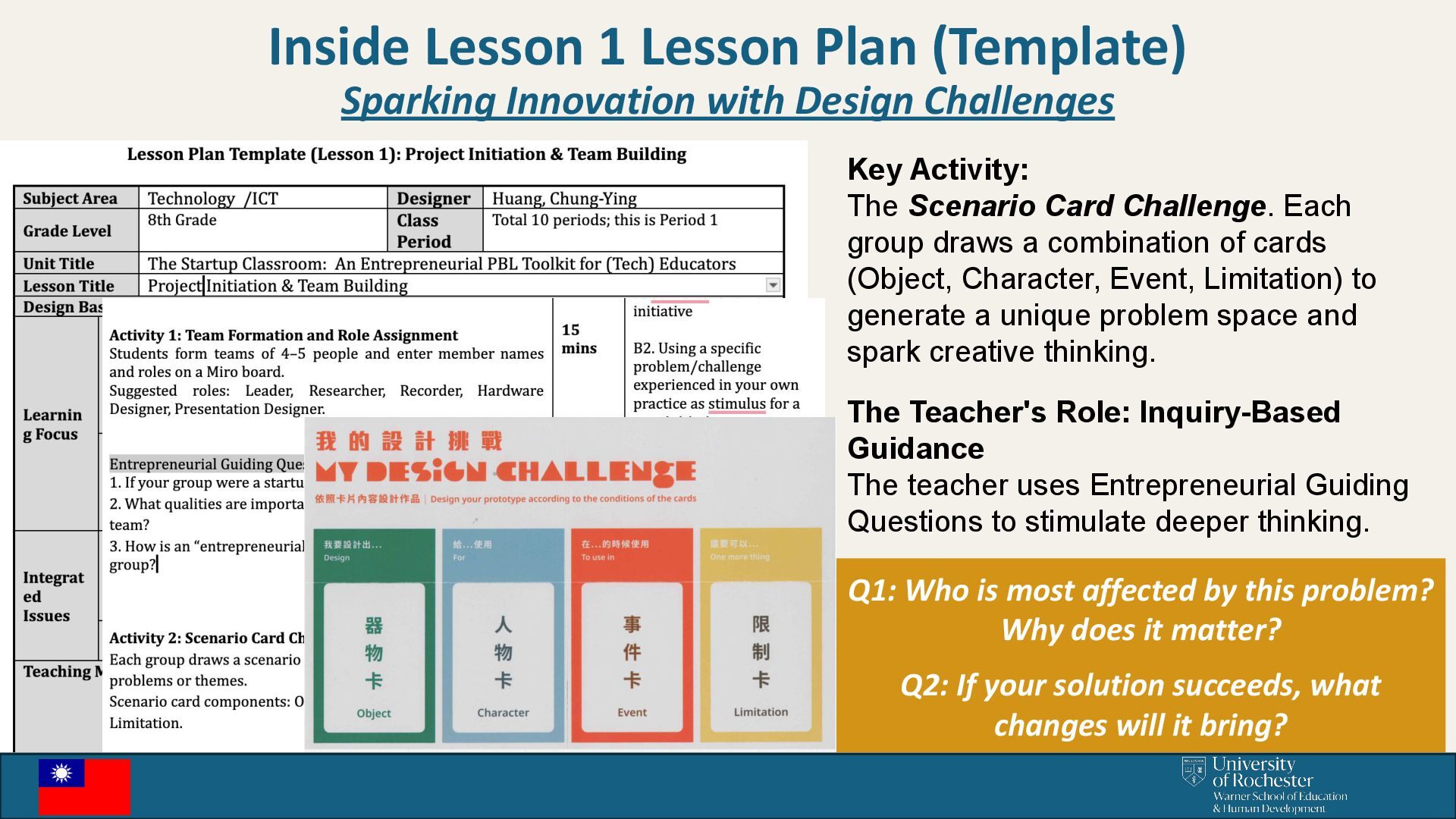 Challenges Key Activity: The Scenario Card Challenge. Each group draws a combination of cards (Object, Character, Event, Limitation) to generate a unique problem space and spark creative thinking. The Teacher's Role: Inquiry-Based Guidance The teacher uses Entrepreneurial Guiding Questions to stimulate deeper thinking. Q1: Who is most affected by this problem? Why does it matter? Q2: If your solution succeeds, what changes will it bring?