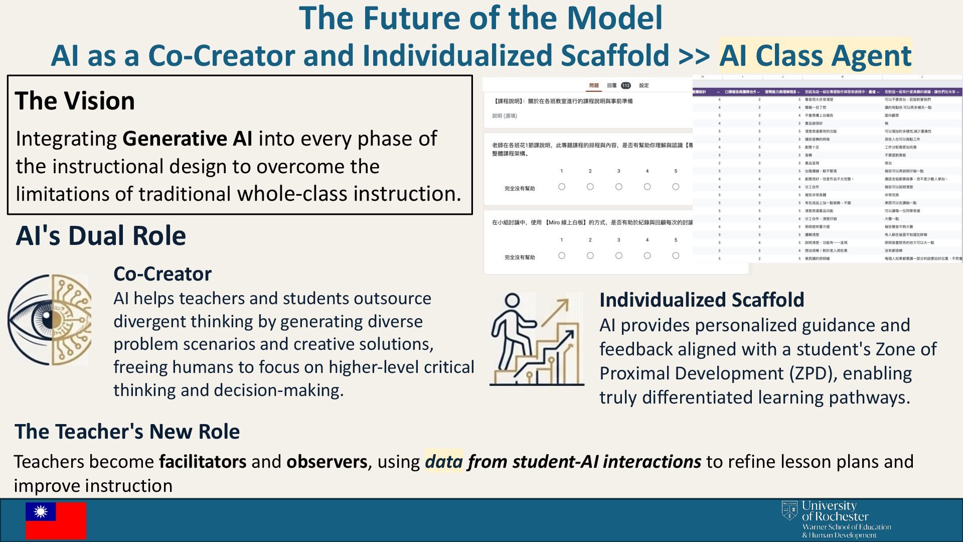 Individualized Scaffold >> AI Class Agent The Vision Integrating Generative AI into every phase of the instructional design to overcome the limitations of traditional whole-class instruction. Co-Creator AI helps teachers and students outsource divergent thinking by generating diverse problem scenarios and creative solutions, freeing humans to focus on higher-level critical thinking and decision-making. AI's Dual Role Individualized Scaffold AI provides personalized guidance and feedback aligned with a student's Zone of Proximal Development (ZPD), enabling truly differentiated learning pathways. The Teacher's New Role Teachers become facilitators and observers, using data from student-AI interactions to refine lesson plans and improve instruction