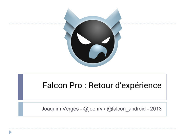 : • Dès que le cœur de l’ appli est stable, publier une BETA (même incomplète) • Informer quand une fonction n’est pas câblée Joaquim Vergès - @joenrv / @falcon_android - 2013