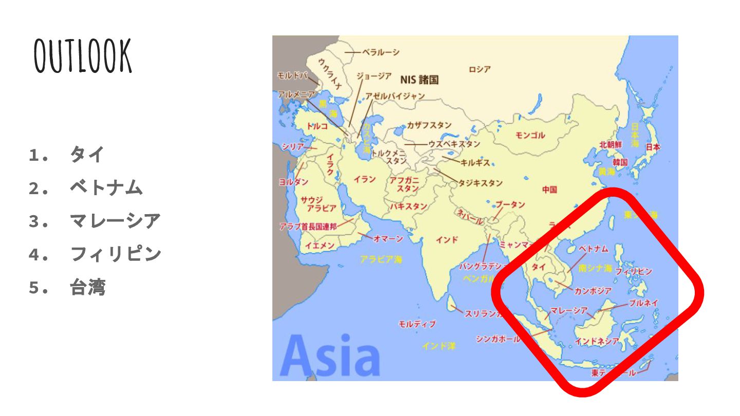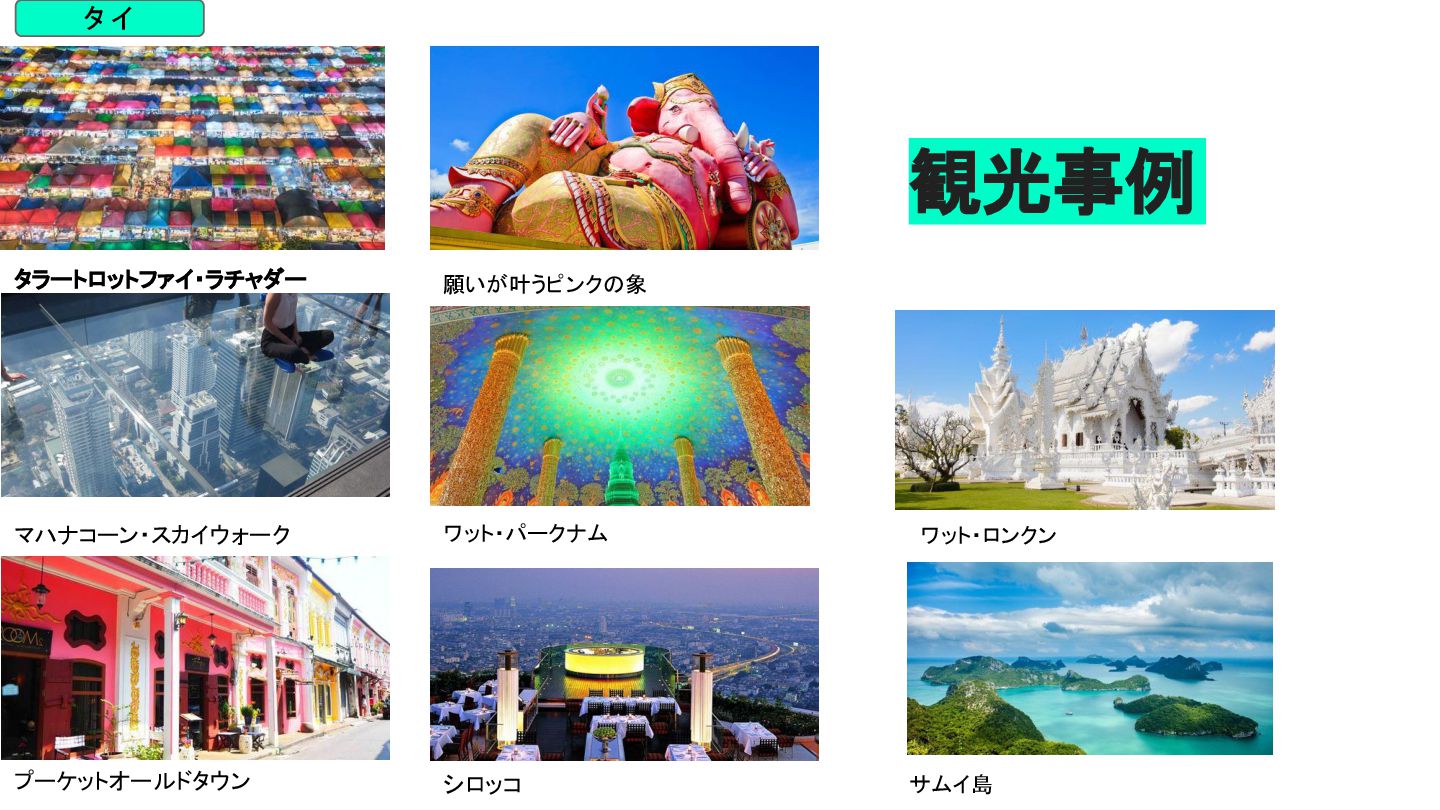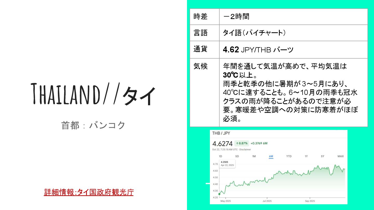1. Thailand//タイ 首都:バンコク 時差 -2時間 言語 タイ語(パイチャート) 通貨 4.62 JPY/THB バーツ