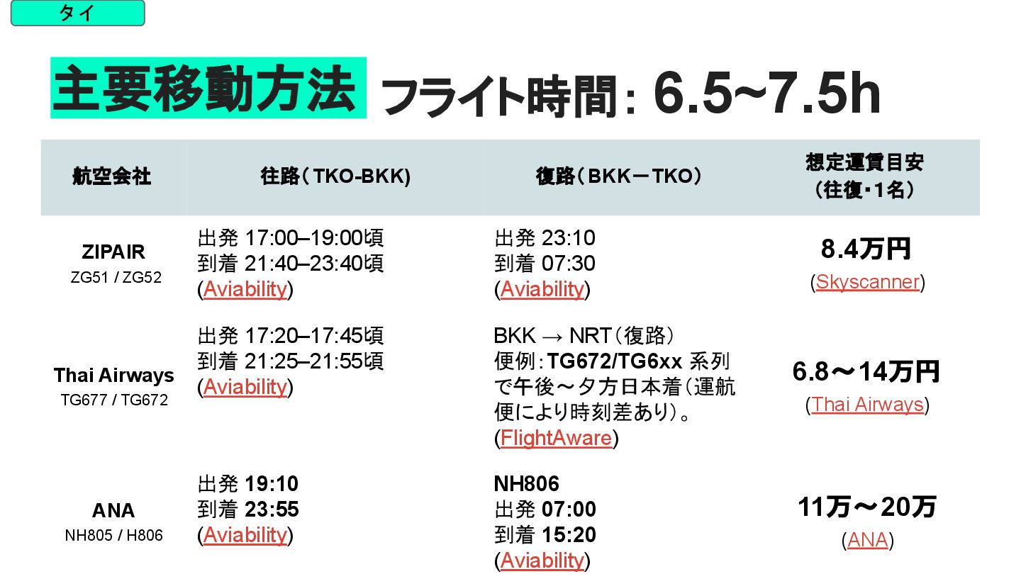 2. 主要移動方法 航空会社 往路(TKO-BKK) 復路(BKK-TKO) 想定運賃目安 (往復・1名) ZIPAIR ZG51 / ZG52
