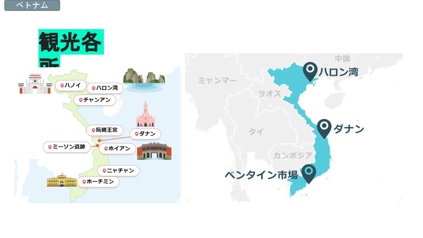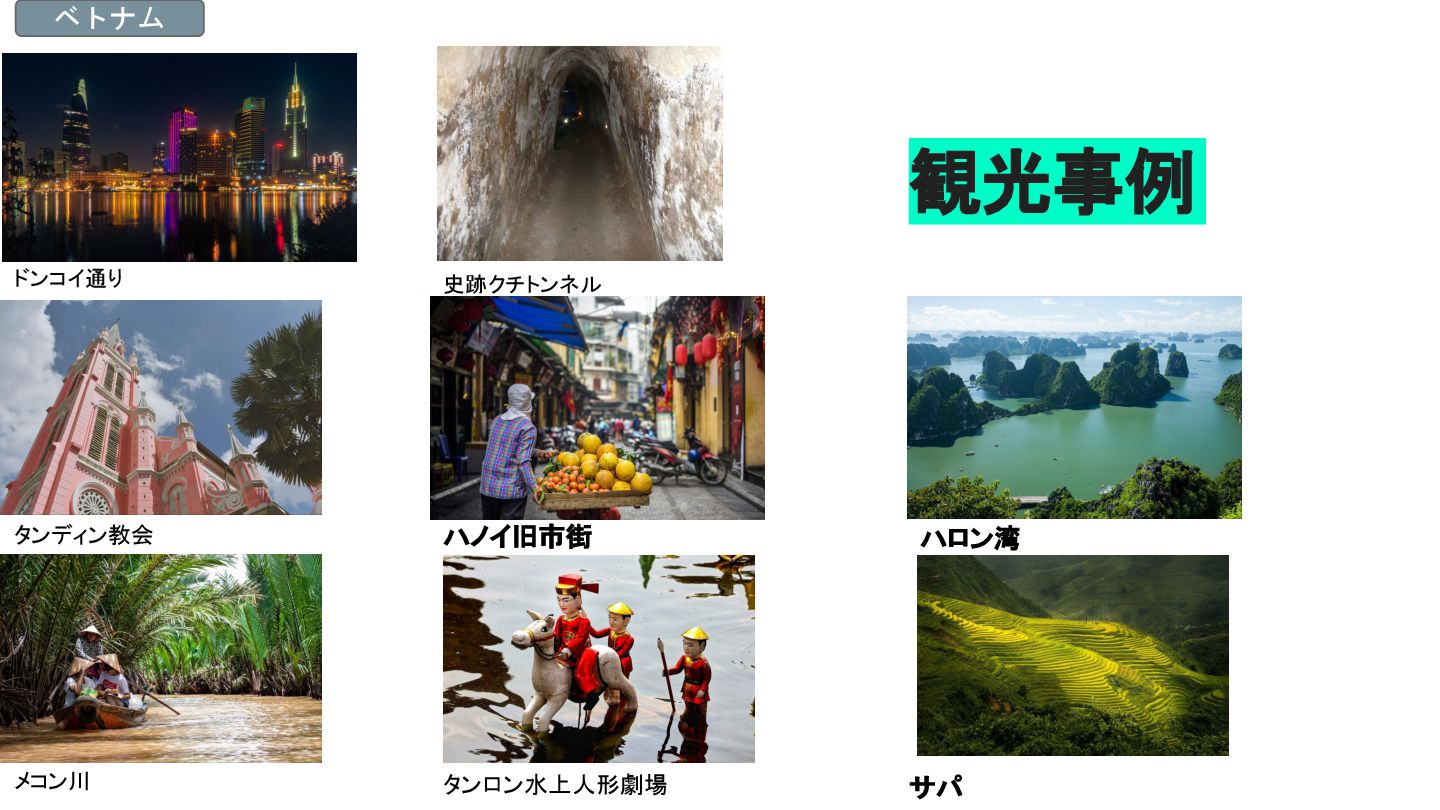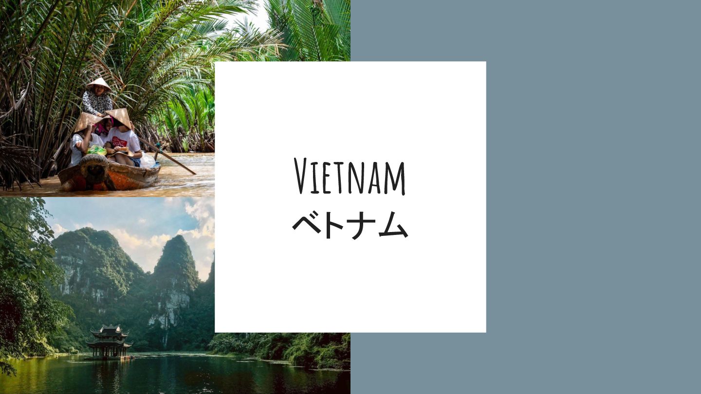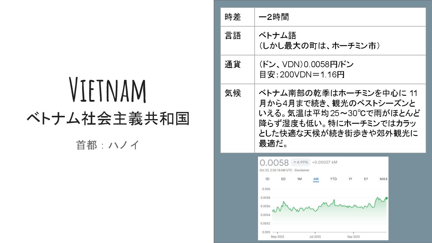 3. Vietnam ベトナム社会主義共和国 首都:ハノイ 時差 ー2時間 言語 ベトナム語 (しかし最大の町は、ホーチミン市) 通貨 (ドン、VDN)0.0058円/ドン