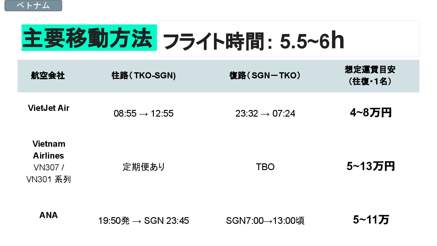 4. 主要移動方法 航空会社 往路(TKO-SGN) 復路(SGN-TKO) 想定運賃目安 (往復・1名) VietJet Air 08:55 →