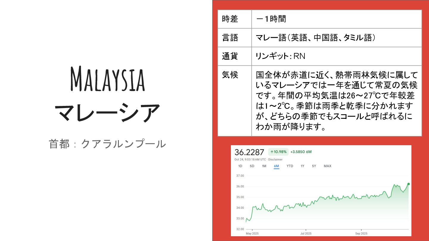 5. Malaysia マレーシア 首都:クアラルンプール 時差 -1時間 言語 マレー語(英語、中国語、タミル語) 通貨 リンギット:RN 気候