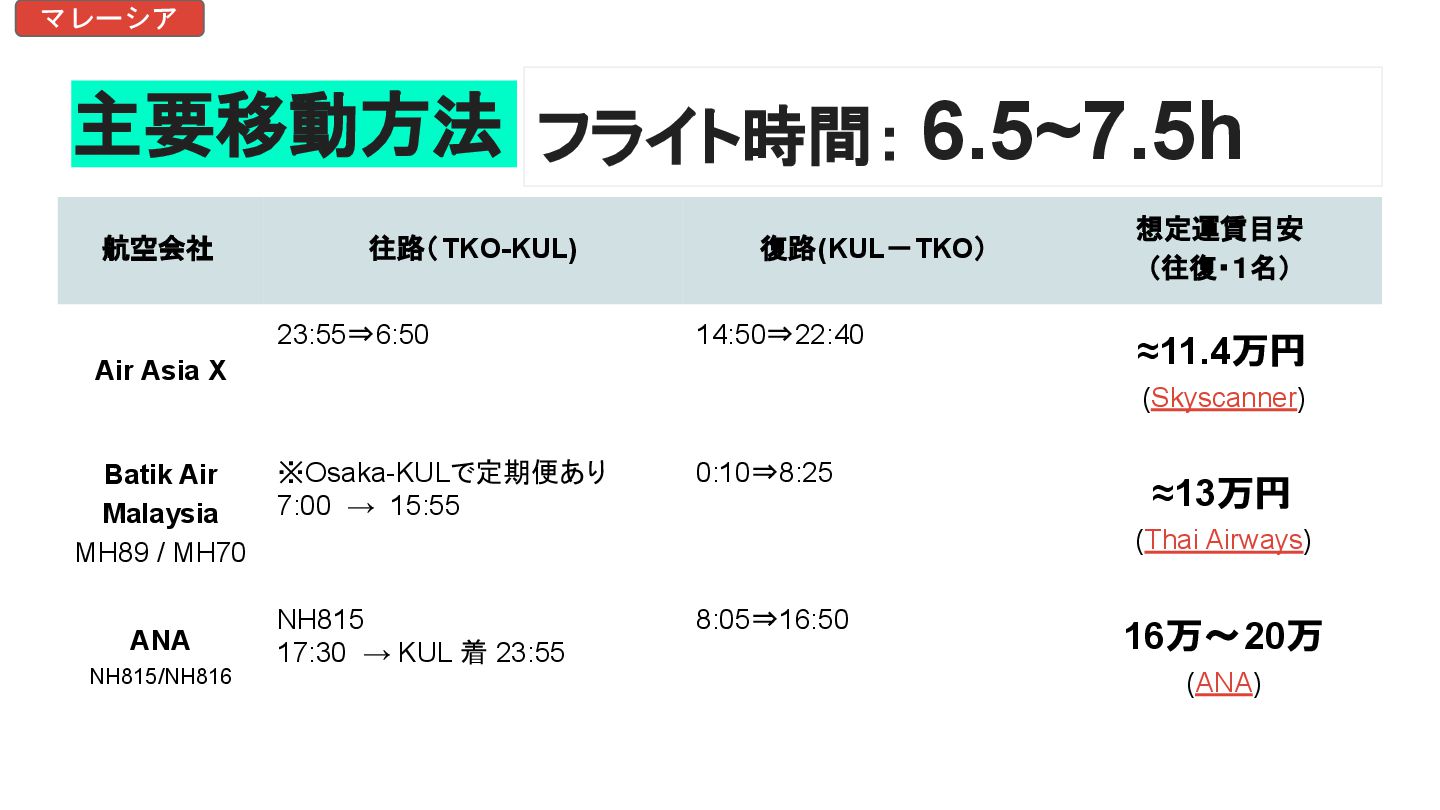 6. 主要移動方法 航空会社 往路(TKO-KUL) 復路(KUL-TKO) 想定運賃目安 (往復・1名) Air Asia X 23:55⇒6:50