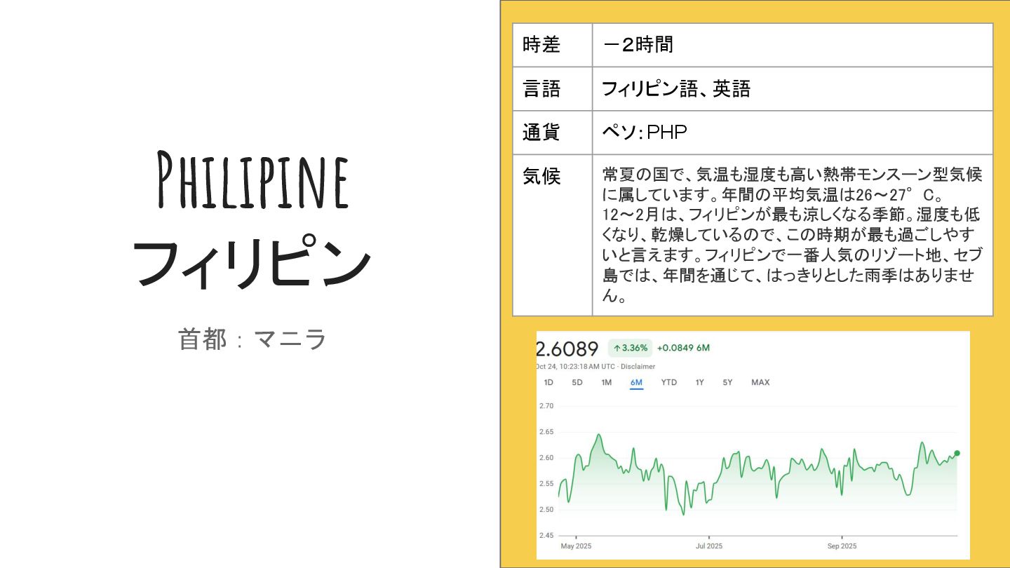 7. Philipine フィリピン 首都:マニラ 時差 -2時間 言語 フィリピン語、英語 通貨 ペソ:PHP 気候