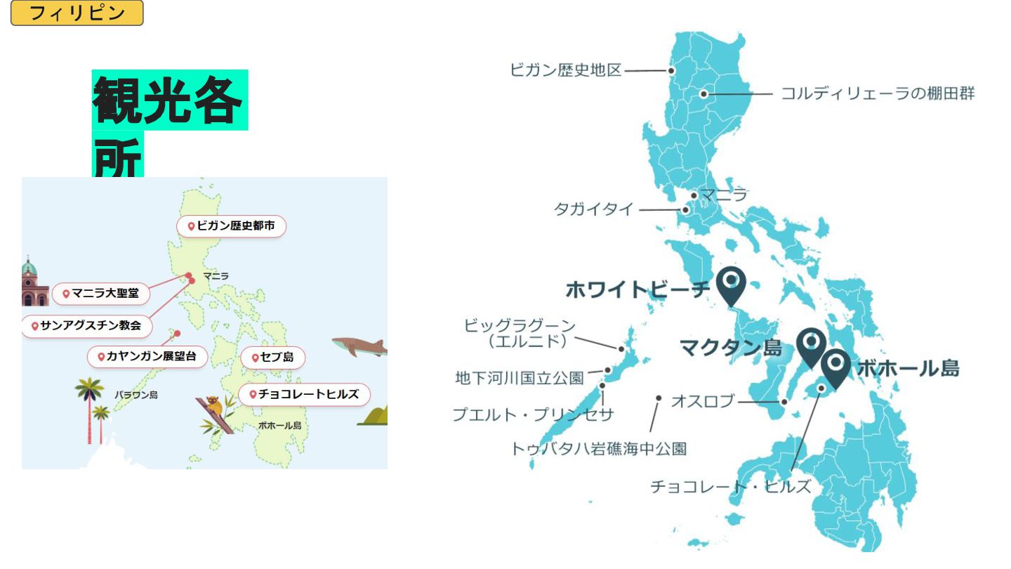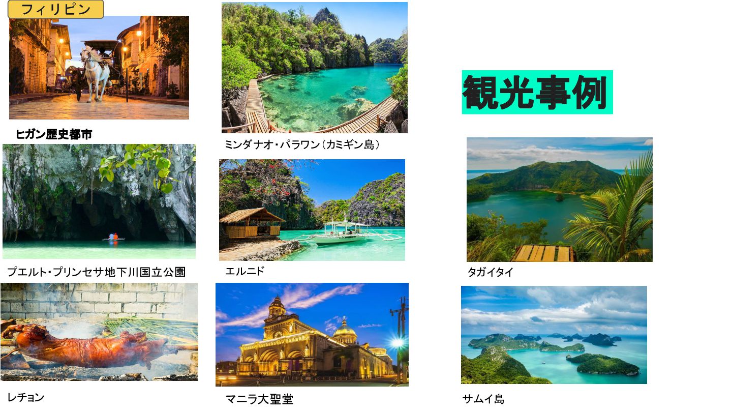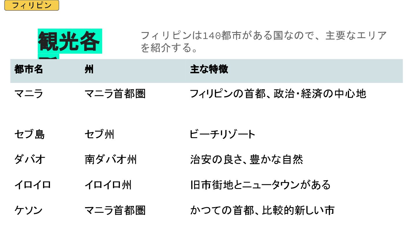 8. 観光各 所 フィリピンは140都市がある国なので、主要なエリア を紹介する。 都市名 州 主な特徴 マニラ マニラ首都圏 フィリピンの首都、政治・経済の中心地