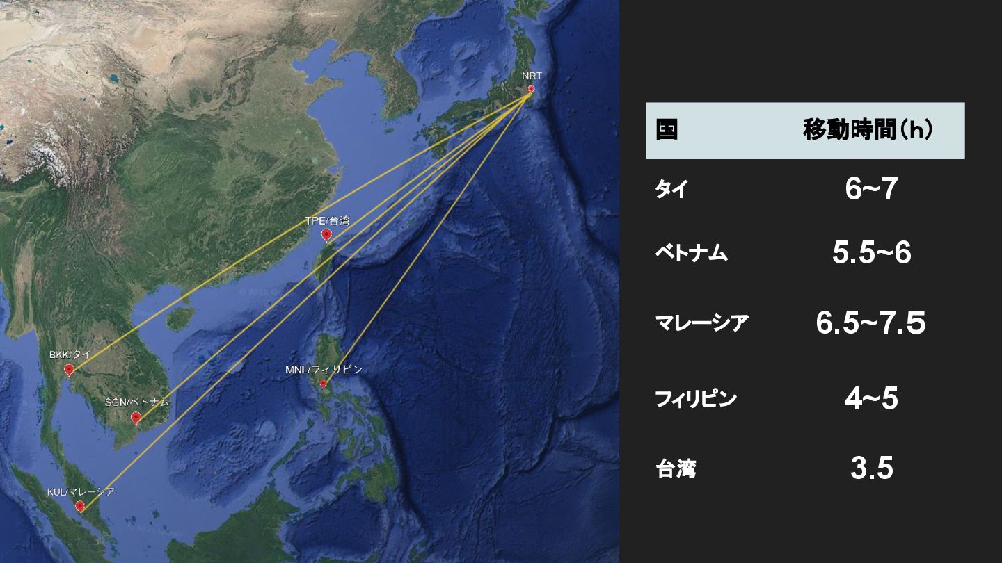 14:50⇒22:40 ≈11.4万円 (Skyscanner) Batik Air Malaysia MH89 / MH70 ※Osaka-KULで定期便あり 7:00 → 15:55 0:10⇒8:25 ≈13万円 (Thai Airways) ANA NH815/NH816 NH815 17:30 → KUL 着 23:55 8:05⇒16:50 16万~20万 (ANA) フライト時間: 6.5~7.5h マレーシア