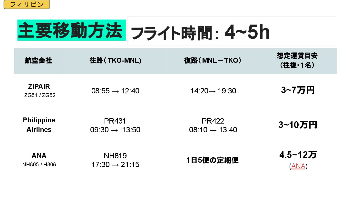 9. 主要移動方法 航空会社 往路(TKO-MNL) 復路(MNL-TKO) 想定運賃目安 (往復・1名) ZIPAIR ZG51 / ZG52