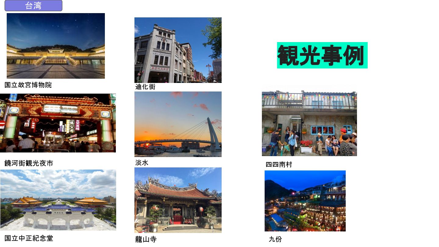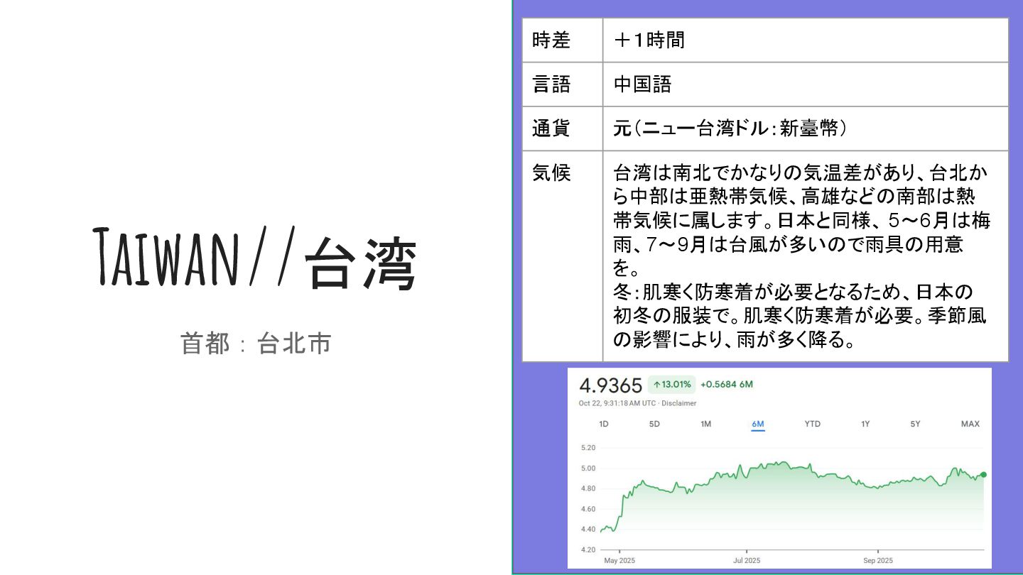 10. Taiwan//台湾 首都:台北市 時差 +1時間 言語 中国語 通貨 元(ニュー台湾ドル:新臺幣) 気候 台湾は南北でかなりの気温差があり、台北か