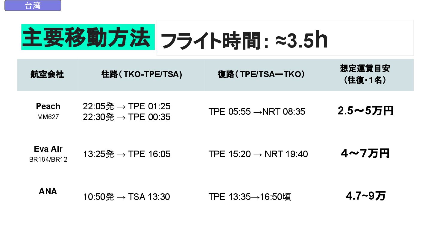 11. 主要移動方法 航空会社 往路(TKO-TPE/TSA) 復路(TPE/TSAーTKO) 想定運賃目安 (往復・1名) Peach MM627 22:05発 →