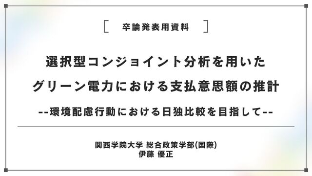 近年、世界各国で脱炭素社会を目指した目標設定や、法規制といった取組が見られる。その実現のためには、国民一人ひとりの環境配慮行動も必要不可欠であるが、アンケート調査では日本の環境配慮行動の低さが指摘されている。しかし、日本における消費者の環境配慮行動の度合いを国際的に比較検討した研究は希少であり、かつ不十分。これより、支払意思額(WTP)を用い、対ドイツ比較を検討する。