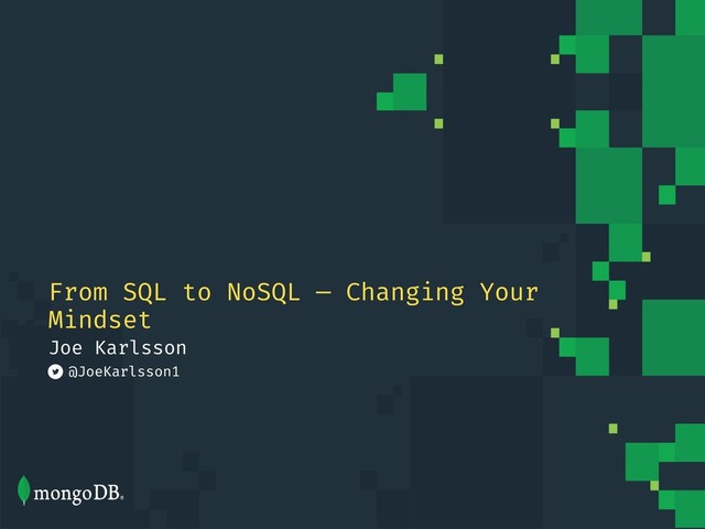 the 4 humongous advantages of MongoDB 3.Change your mindset in 3 key ways @JoeKarlsson1 Row Column Table Database Index Join Join Left Outer Join Recursive Common Table Expressions View Transaction Document Field Collection Database Index Embedding Database References $lookup $graphLookup View Transaction