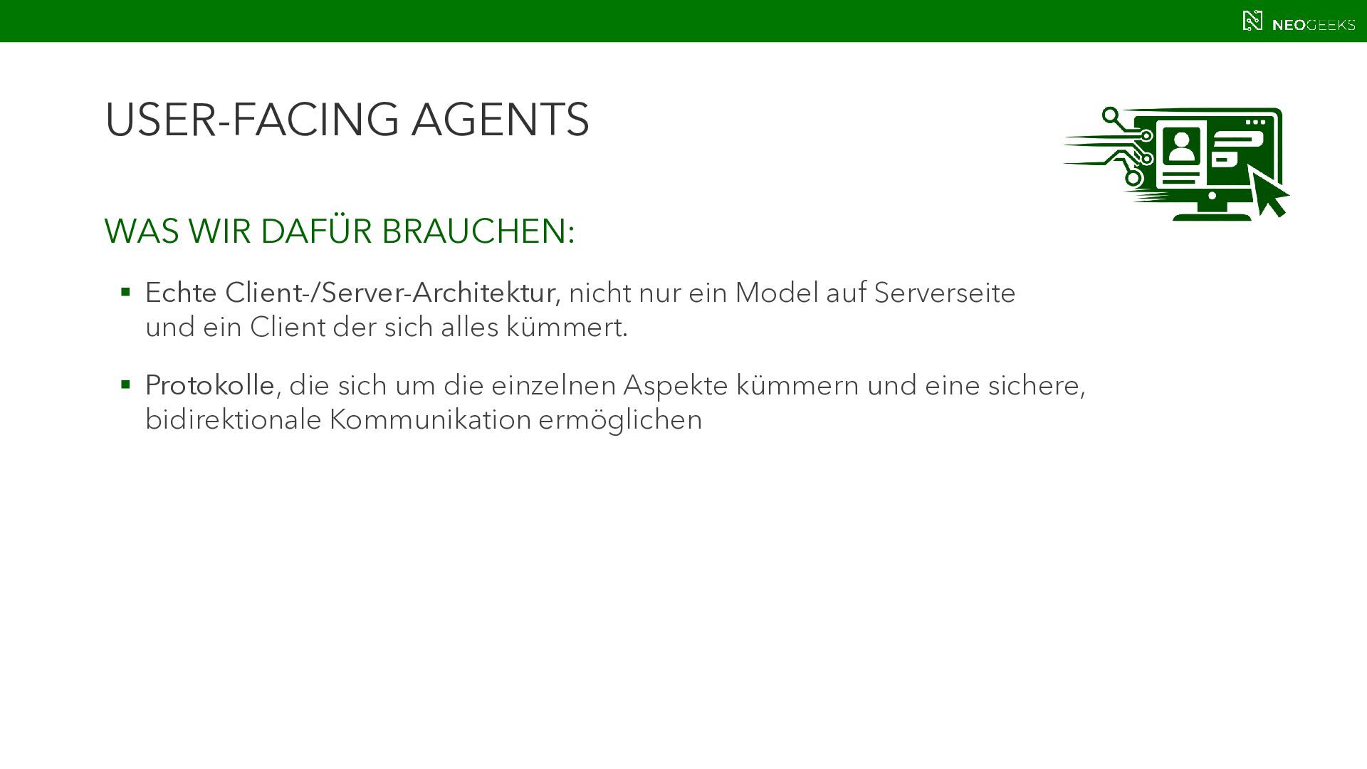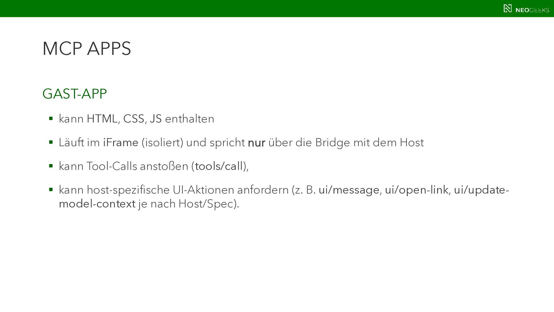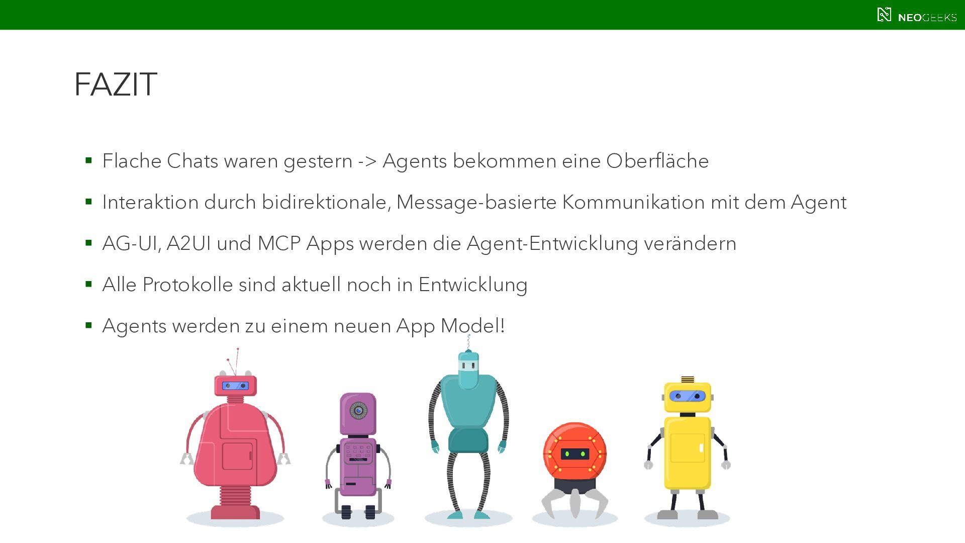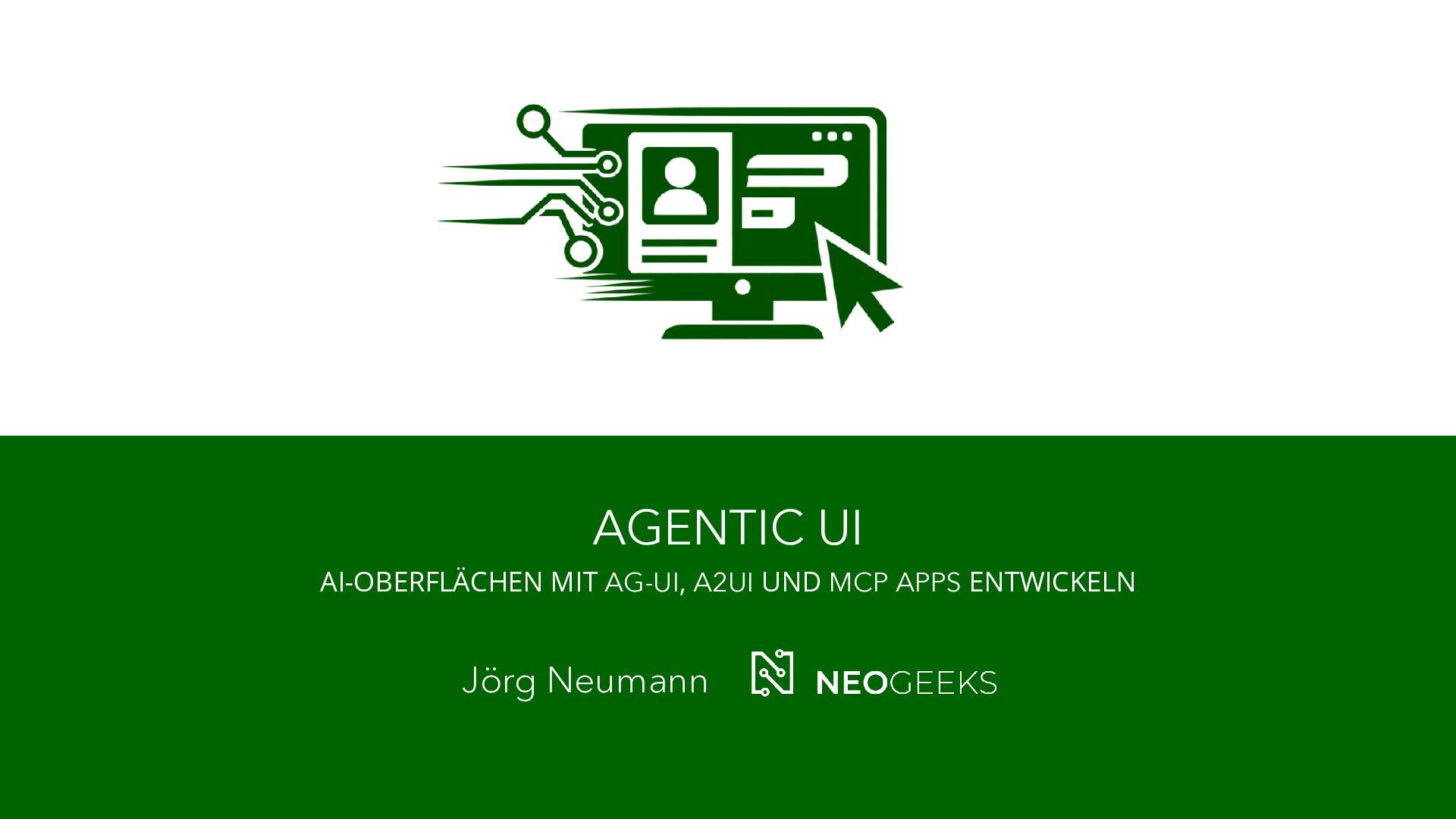 Die Zeiten, in denen AI aus simplen Chats bestand, sind längst vorbei. Heute bildet sich mit AI-Agents ein völlig neues Anwendungsmodell. Und dieses benötigt Benutzerinteraktion. Ob grafische Darstellungen von Modellausgaben oder Benutzerinteraktionen über AI-generierte Oberflächen: Mit AG-UI, A2UI und MCP Apps stehen gleich drei Standards bereit, die AI mit dem Anwender verbinden wollen. Jörg Neumann stellt beide Standards vor und zeigt, wie die Anwendungen von morgen aussehen.