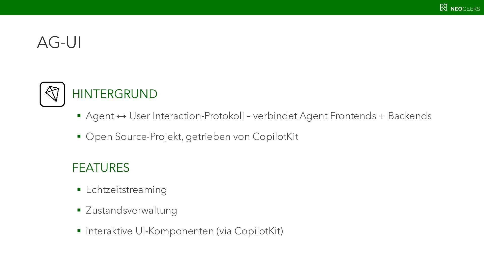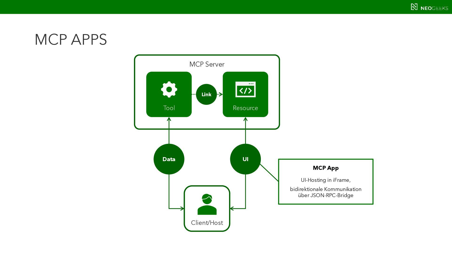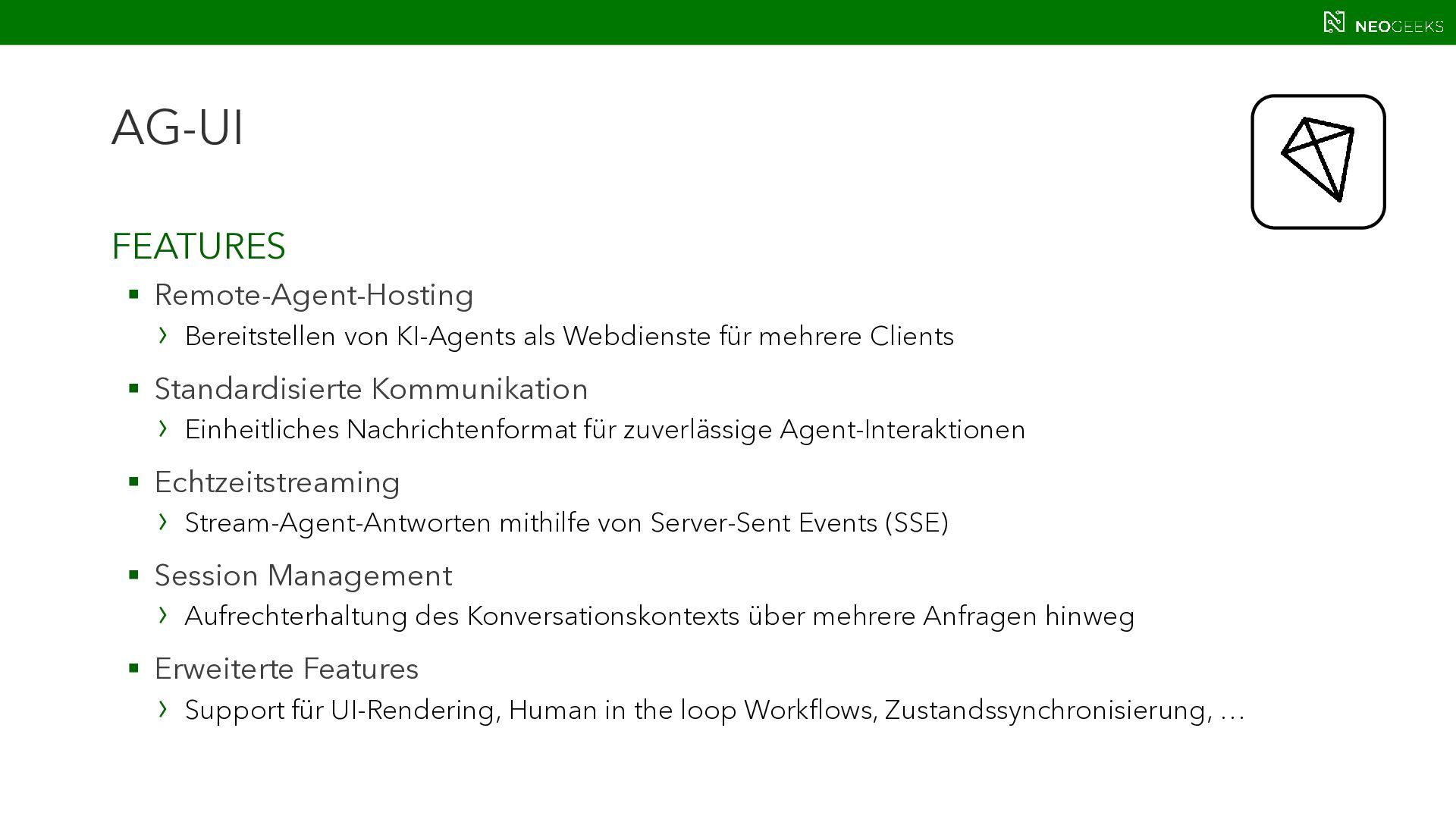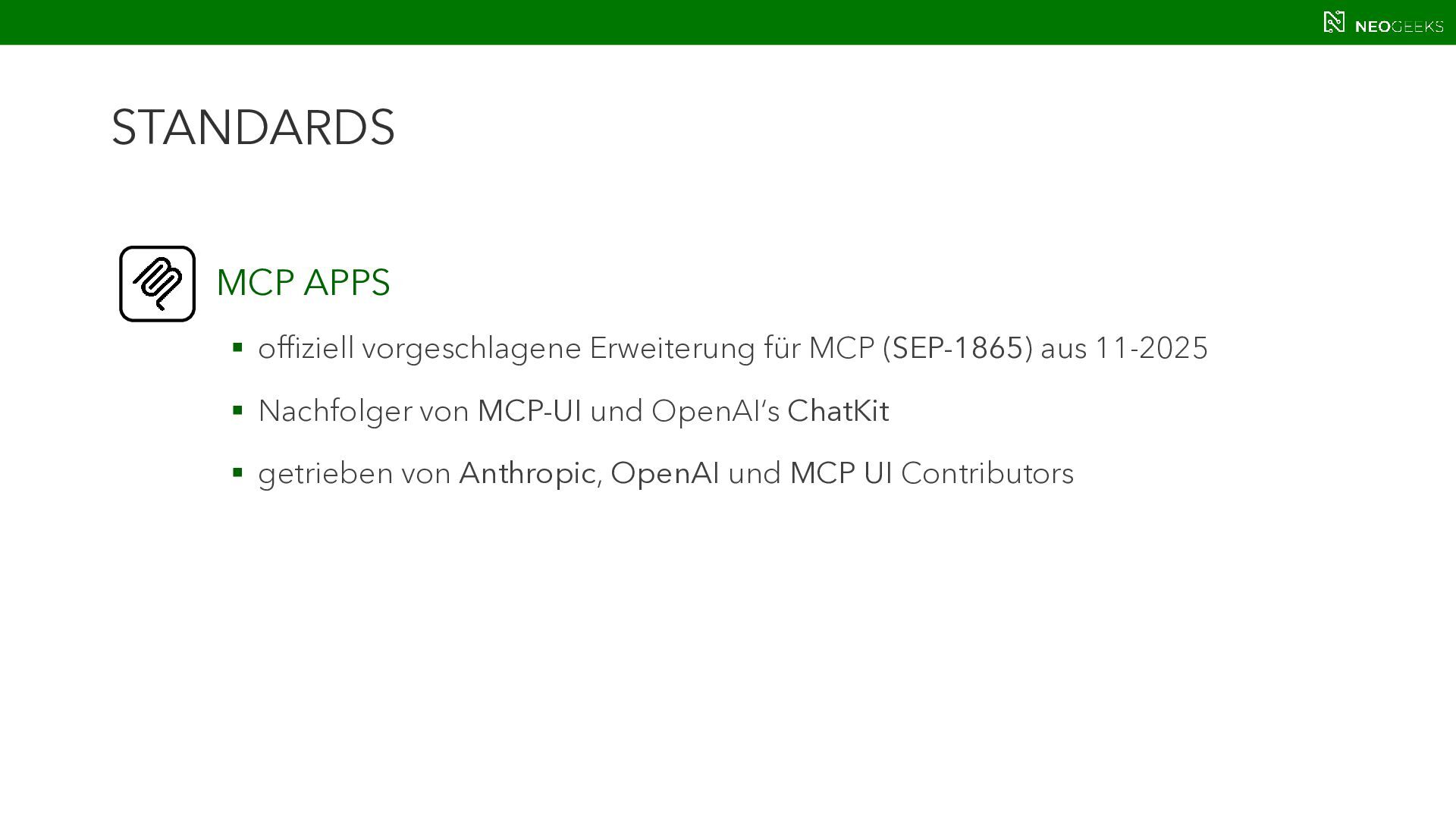 Die Zeiten, in denen AI aus simplen Chats bestand, sind längst vorbei. Heute bildet sich mit AI-Agents ein völlig neues Anwendungsmodell. Und dieses benötigt Benutzerinteraktion. Ob grafische Darstellungen von Modellausgaben oder Benutzerinteraktionen über AI-generierte Oberflächen: Mit AG-UI, A2UI und MCP Apps stehen gleich drei Standards bereit, die AI mit dem Anwender verbinden wollen. Jörg Neumann stellt beide Standards vor und zeigt, wie die Anwendungen von morgen aussehen.