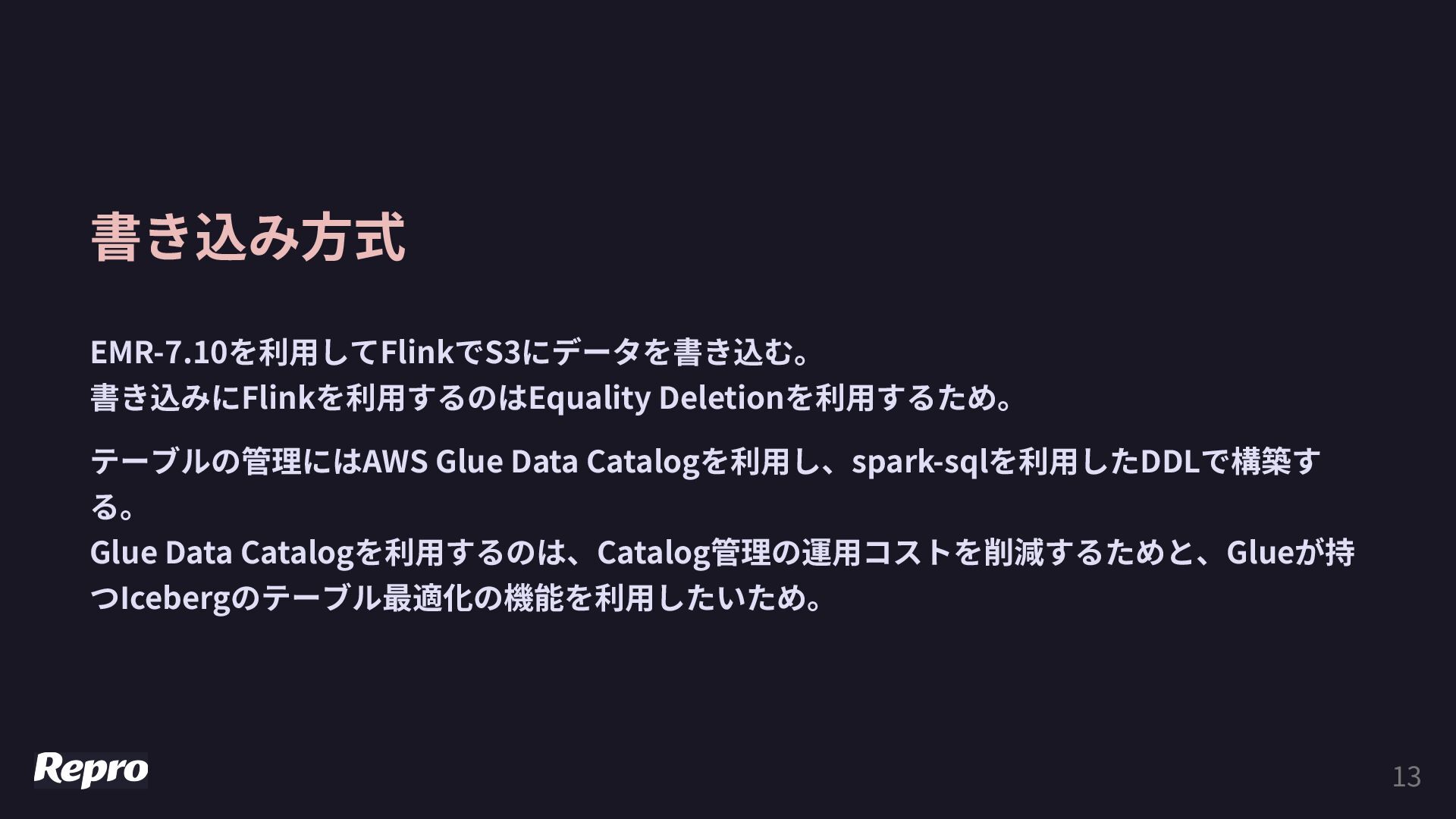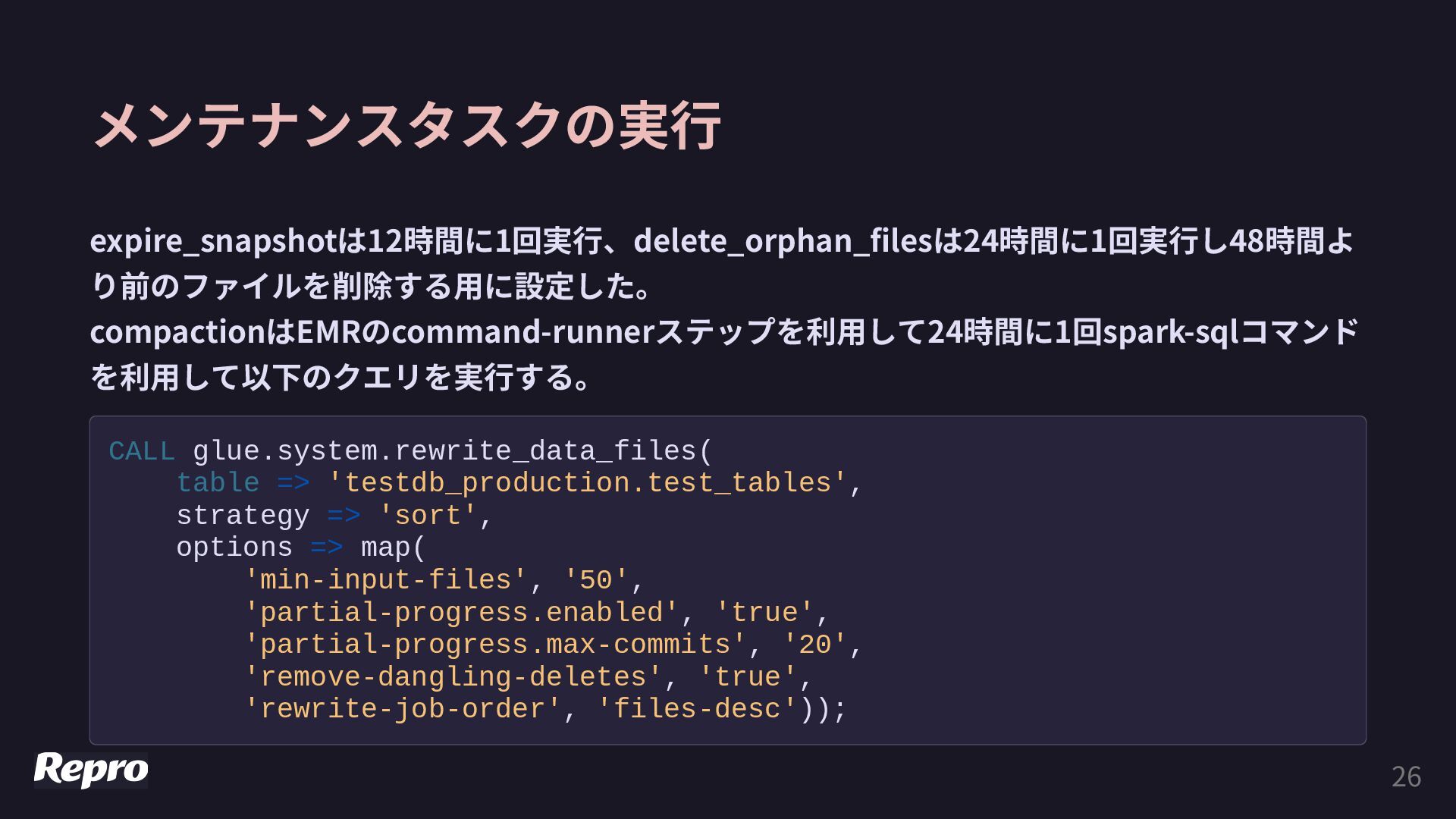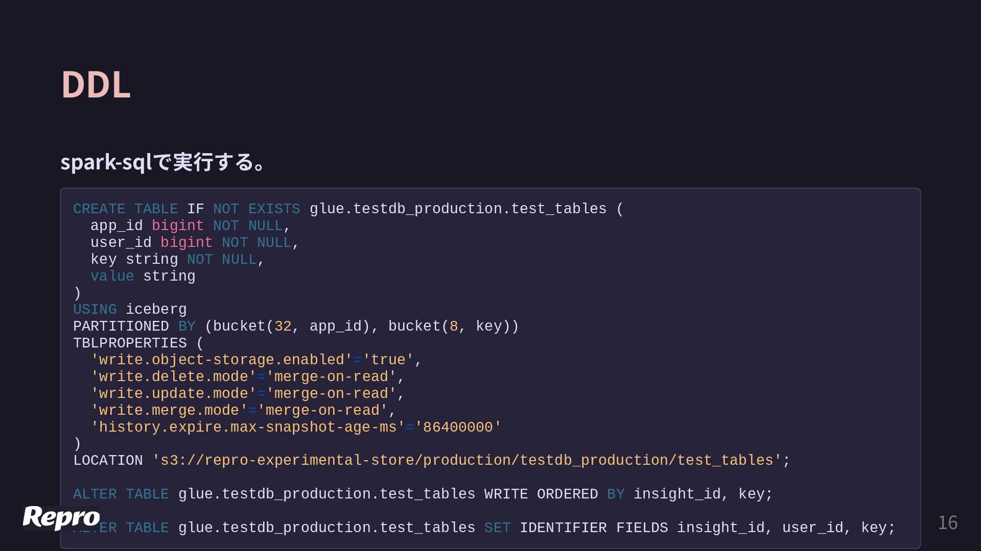 bigint NOT NULL, user_id bigint NOT NULL, key string NOT NULL, value string ) USING iceberg PARTITIONED BY (bucket(32, app_id), bucket(8, key)) TBLPROPERTIES ( 'write.object-storage.enabled'='true', 'write.delete.mode'='merge-on-read', 'write.update.mode'='merge-on-read', 'write.merge.mode'='merge-on-read', 'history.expire.max-snapshot-age-ms'='86400000' ) LOCATION 's3://repro-experimental-store/production/testdb_production/test_tables'; ALTER TABLE glue.testdb_production.test_tables WRITE ORDERED BY insight_id, key; ALTER TABLE glue.testdb_production.test_tables SET IDENTIFIER FIELDS insight_id, user_id, key; 16
