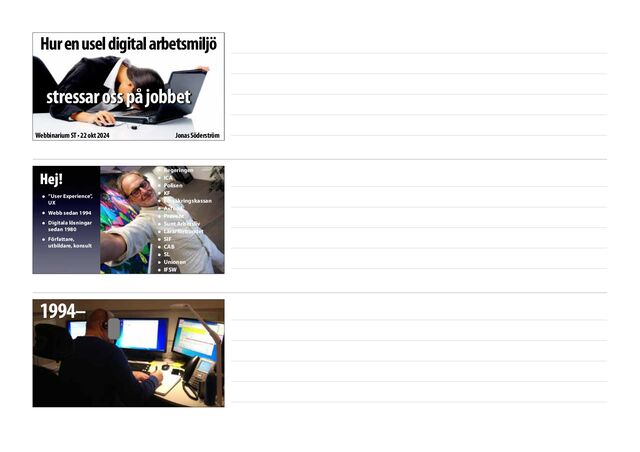 Anpassat till människor & uppgift Teknisk kvalitet: stabilitet, kapacitet Jonas Söderström • 2022 God digital arbetsmiljö God användbarhet: enkelt, intuitivt, konsekvent, lätt att hitta rätt, svårt att göra fel, bra utbildning och införande Fungerande teknik: stabilt, inga krascher, snabbt nätverk, snabb respons Nytta för arbetet: fl exibilitet, enklare administration, fokus på kärnuppgift, empowerment, självständighet Inverkan på själva arbetet Anpassat till människor & uppgift Teknisk kvalitet: stabilitet, kapacitet Jonas Söderström • 2022 Dålig digital arbetsmiljö ”IT-strul”: servern nere, printern krånglar, långsamt nätverk, långa väntetider, uppdateringar som stör arbetet Dålig användbarhet: orimligt många klick, svårt att hitta, lätt att göra fel, svag feedback, dålig utbildning Tids- och motivationstjuvar: detaljstyrning, mer administration, brist på fl exibilitet, "onödigt och oskäligt arbete”, stödjer inte verkliga uppgifter Anpassat till människor & uppgift Inverkan på själva arbetet Teknisk kvalitet: stabilitet, kapacitet