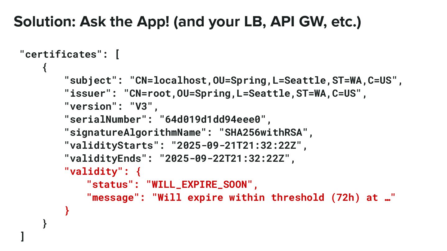 "certificates": [ { "subject": "CN=localhost,OU=Spring,L=Seattle,ST=WA,C=US", "issuer": "CN=root,OU=Spring,L=Seattle,ST=WA,C=US", "version": "V3", "serialNumber": "64d019d1dd94eee0", "signatureAlgorithmName": "SHA256withRSA", "validityStarts": "2025-09-21T21:32:22Z", "validityEnds": "2025-09-22T21:32:22Z", "validity": { "status": "WILL_EXPIRE_SOON", "message": "Will expire within threshold (72h) at …" } } ]