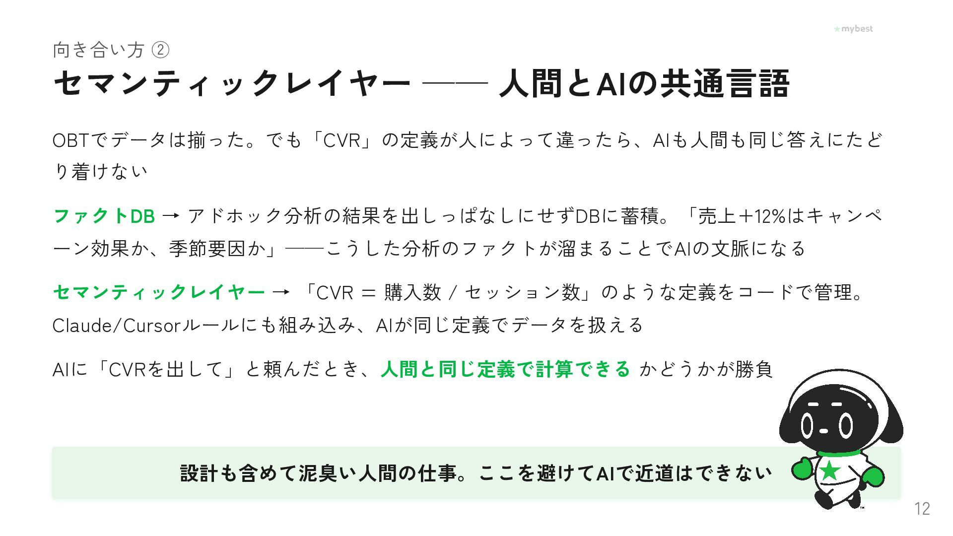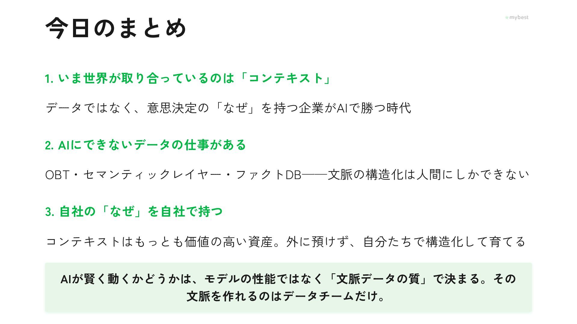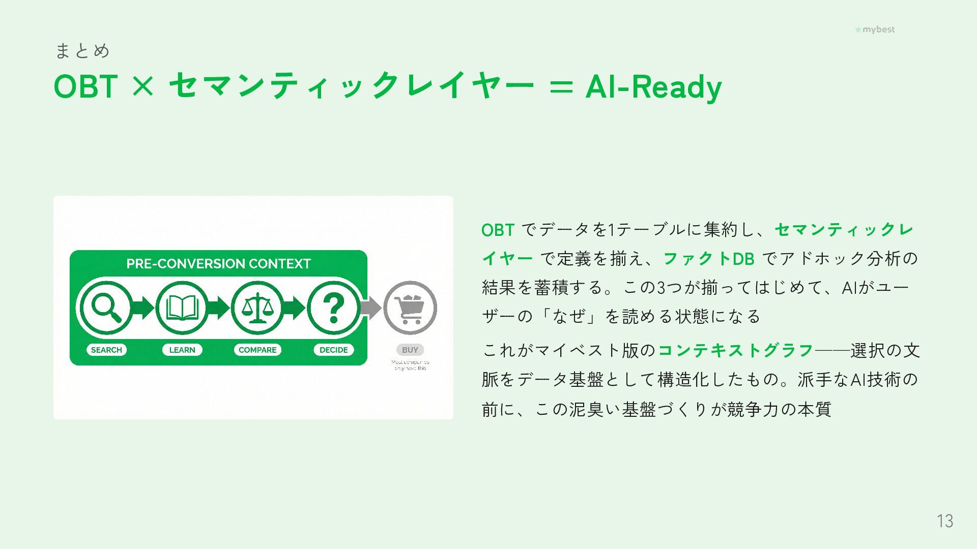 Foundation Capitalが提唱し話題の「コンテキストグラフ」。AIエージェントが賢く動くために必要なのは、データ量ではなく「なぜその選択をしたか」という文脈データだった──。月間3,000万UUの選択行動データを持つマイベストが、OBT・セマンティックレイヤー・ファクトDBで文脈を構造化し、AI-Readyな基盤を泥臭く作っている取り組みを紹介します。