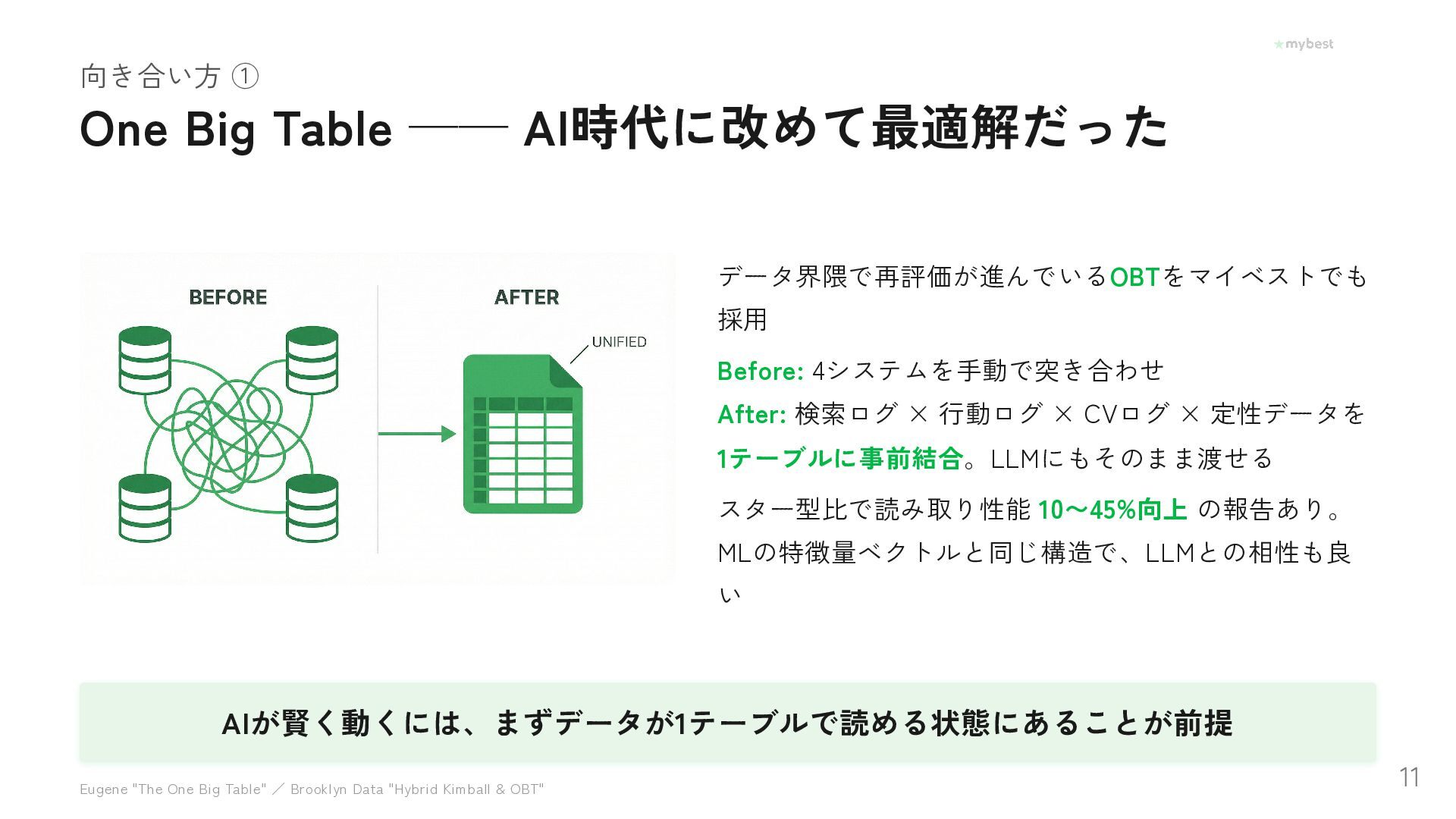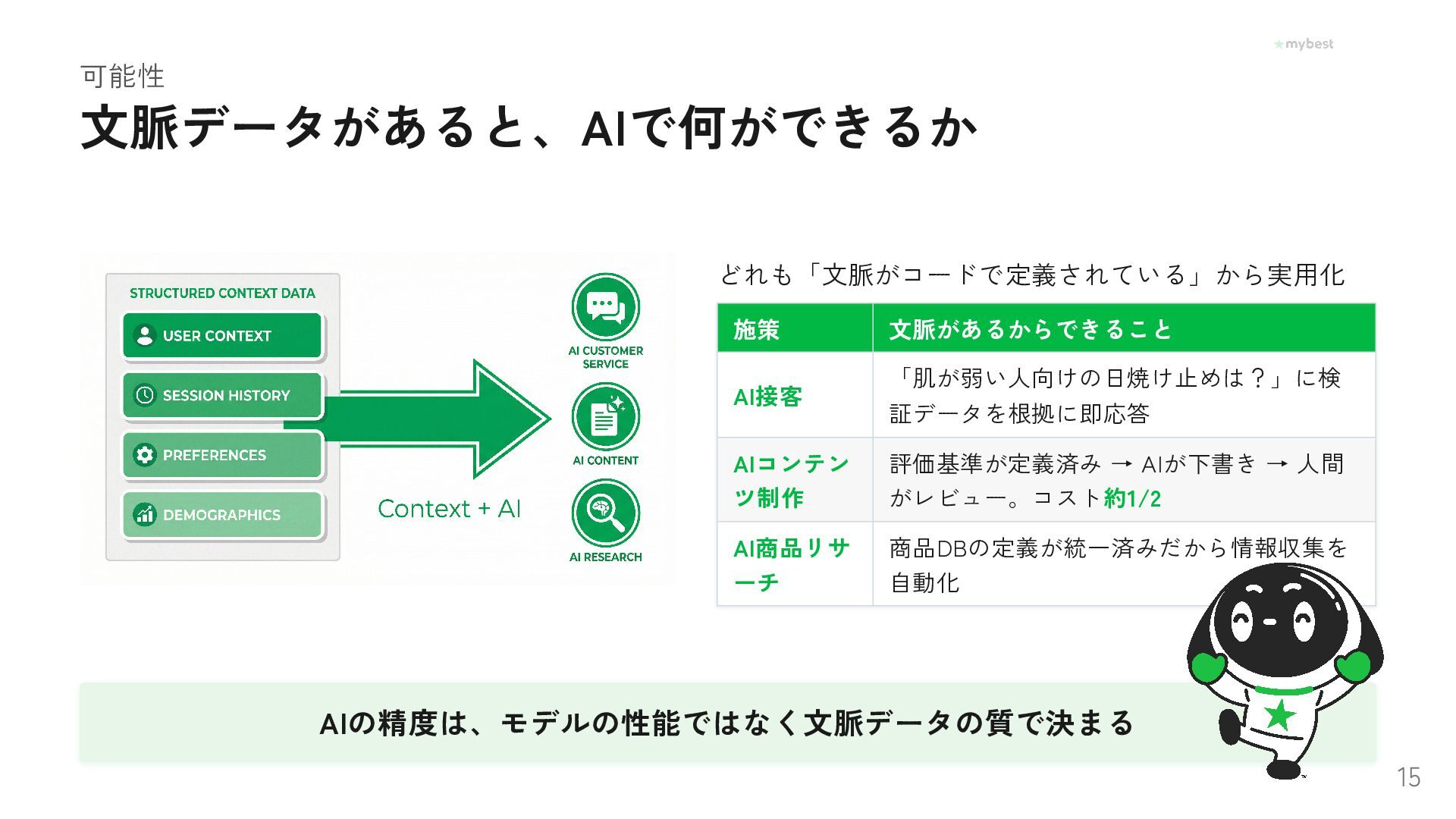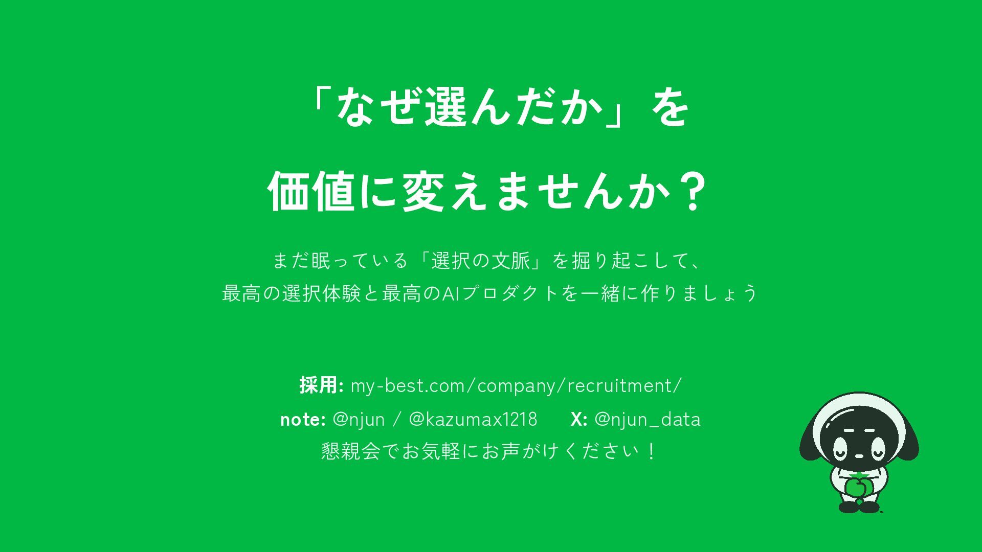 Foundation Capitalが提唱し話題の「コンテキストグラフ」。AIエージェントが賢く動くために必要なのは、データ量ではなく「なぜその選択をしたか」という文脈データだった──。月間3,000万UUの選択行動データを持つマイベストが、OBT・セマンティックレイヤー・ファクトDBで文脈を構造化し、AI-Readyな基盤を泥臭く作っている取り組みを紹介します。