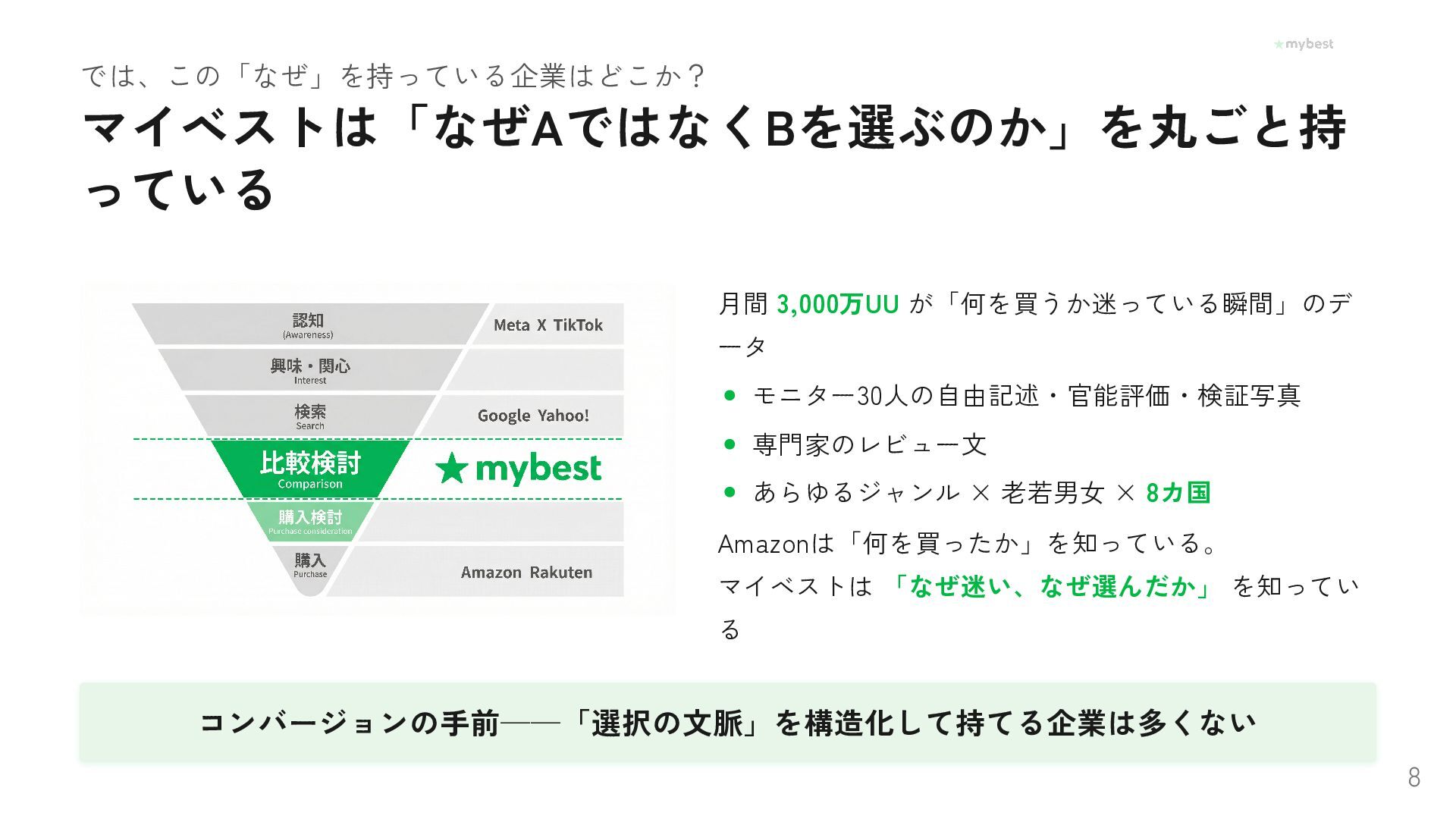 No. ユーザーがなぜその商品を選んだかはLLMの学習データ にない。各企業のサービス上にしか存在しない ユーザーの「なぜ」を構造化して持てる企業だけが、AIで勝てる Foundation Capital "Context Graphs" / Atlan CEO Prukalpa "But Who Actually Captures It?" 7