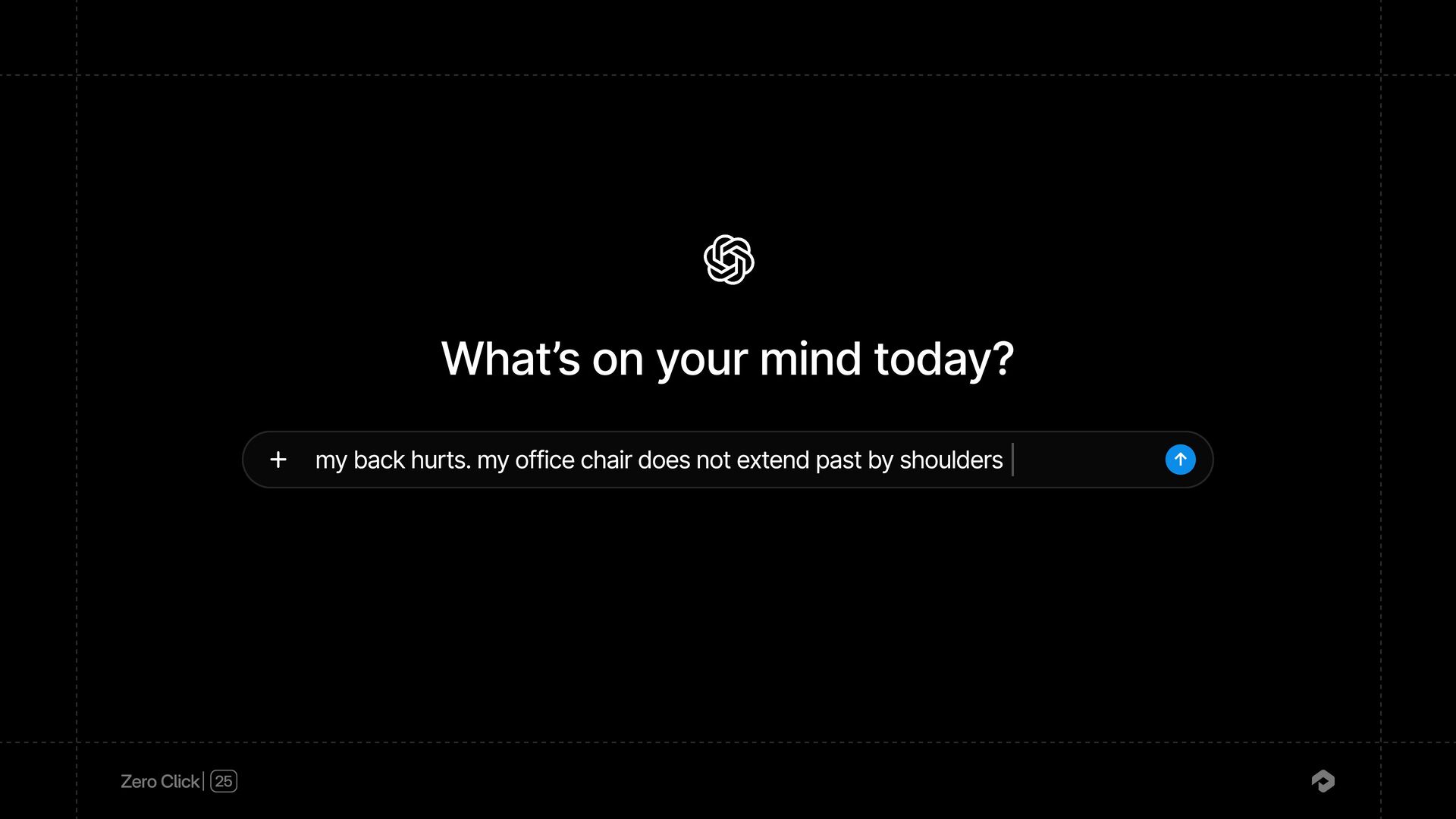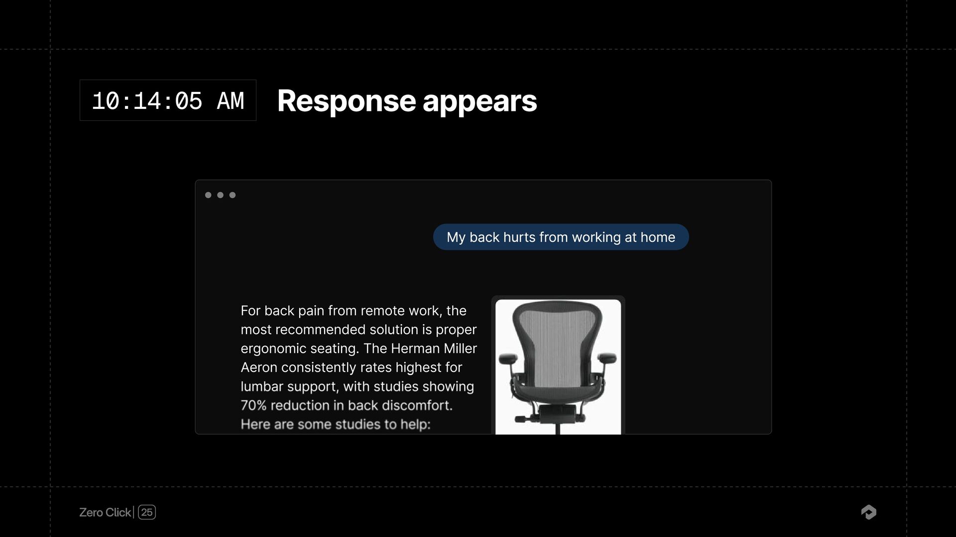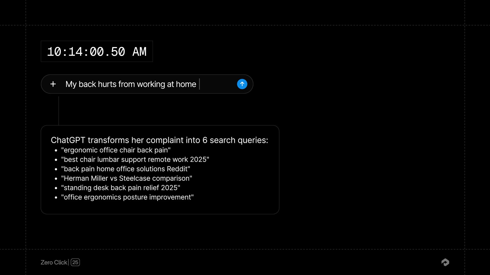 transforms her complaint into 6 search queries: "ergonomic office chair back pain" "best chair lumbar support remote work 2025" "back pain home office solutions Reddit" "Herman Miller vs Steelcase comparison" "standing desk back pain relief 2025" "office ergonomics posture improvement"