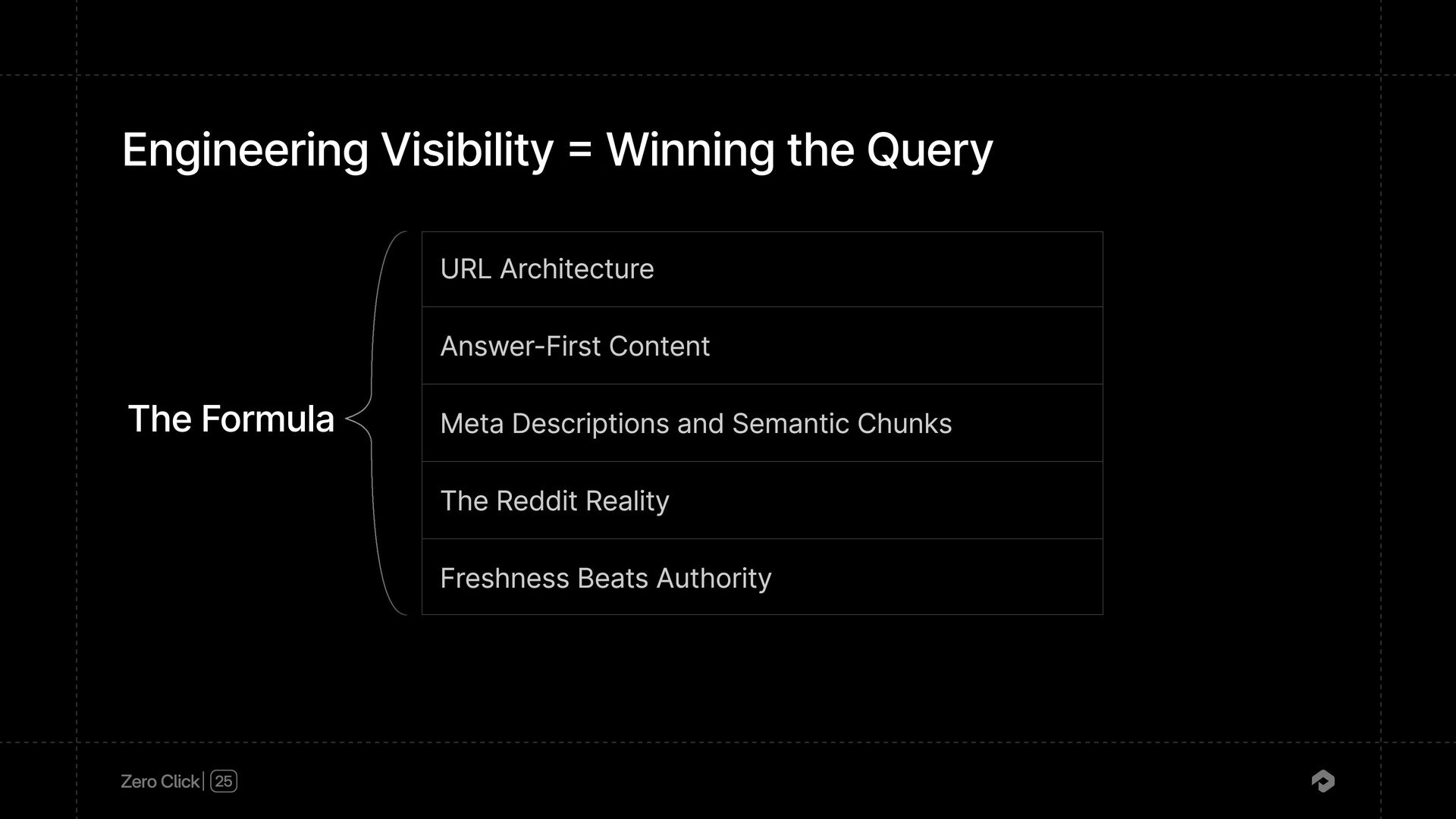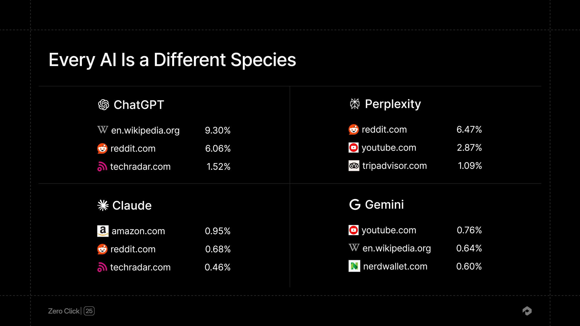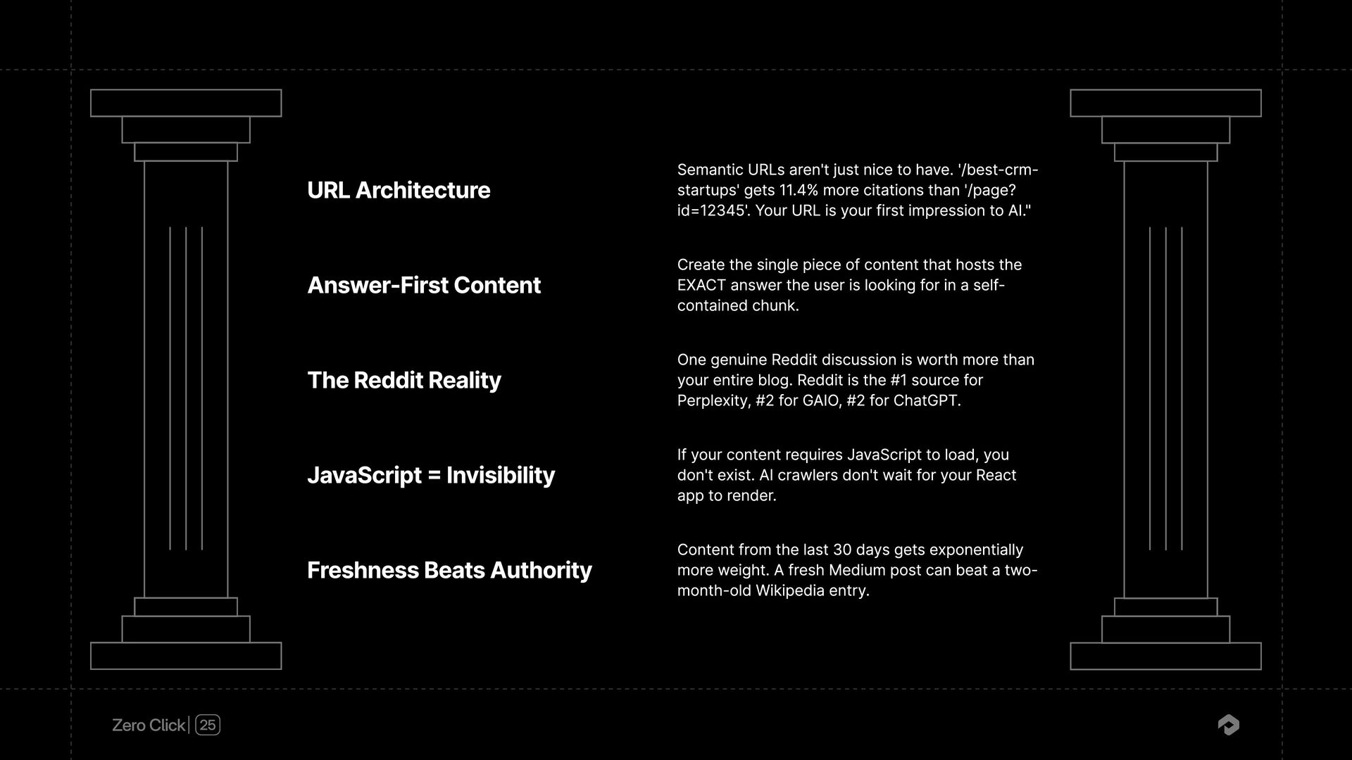 startups' gets 11.4% more citations than '/page? id=12345'. Your URL is your first impression to AI." Answer-First Content Create the single piece of content that hosts the EXACT answer the user is looking for in a self- contained chunk. The Reddit Reality One genuine Reddit discussion is worth more than your entire blog. Reddit is the #1 source for Perplexity, #2 for GAIO, #2 for ChatGPT. JavaScript = Invisibility If your content requires JavaScript to load, you don't exist. AI crawlers don't wait for your React app to render. Freshness Beats Authority Content from the last 30 days gets exponentially more weight. A fresh Medium post can beat a two- month-old Wikipedia entry.