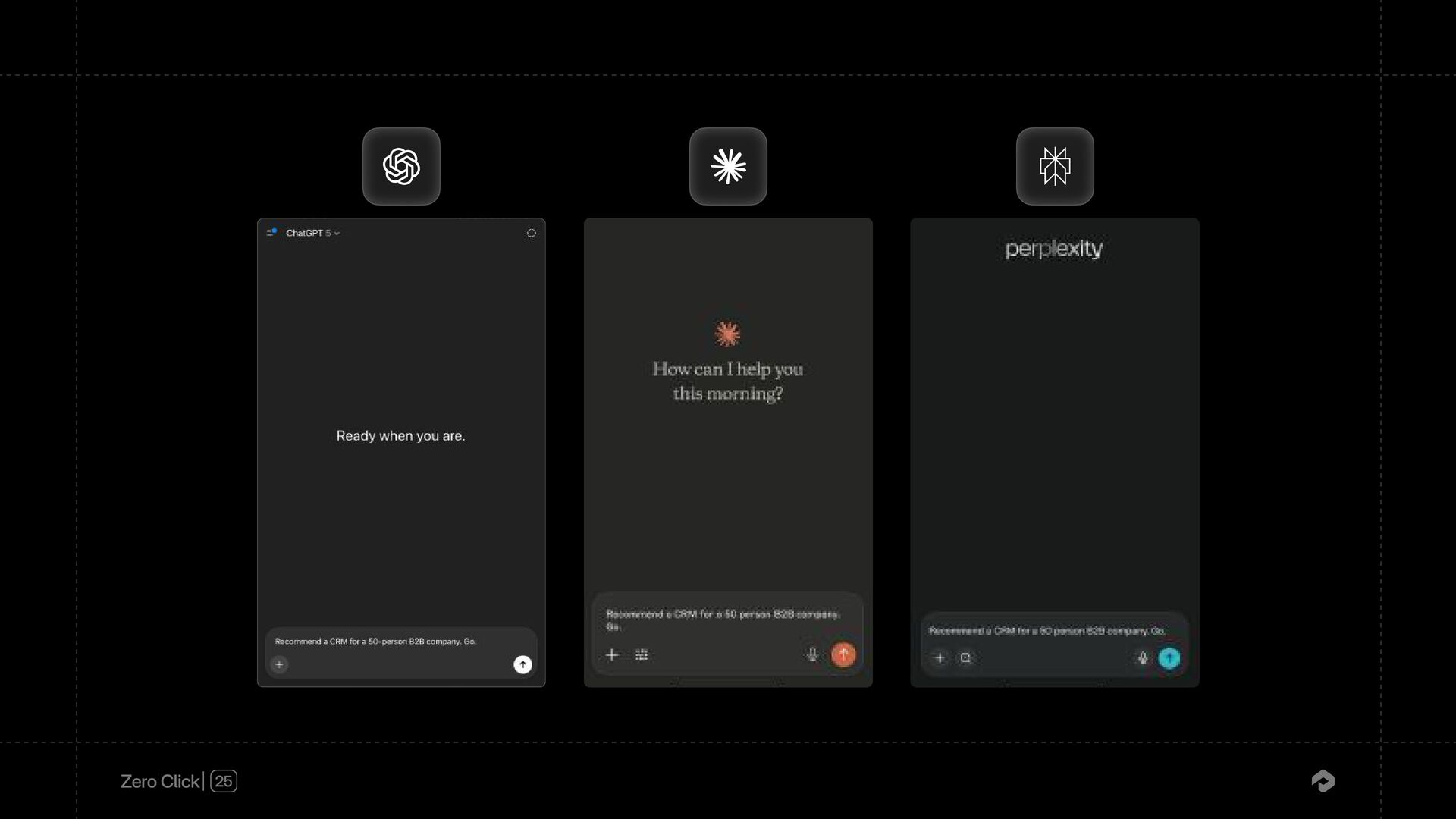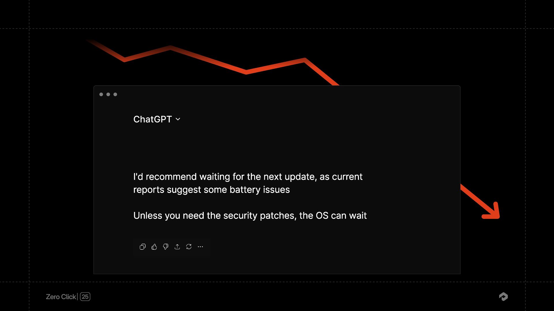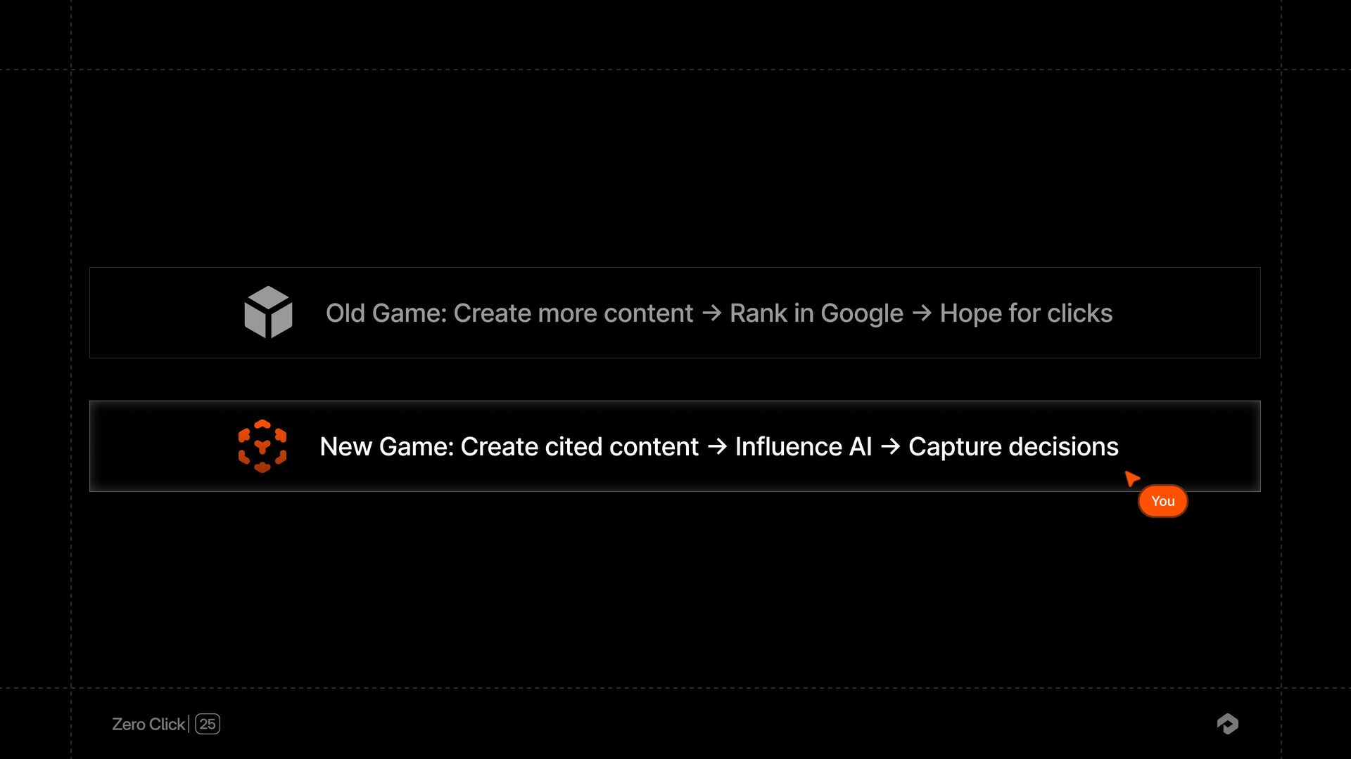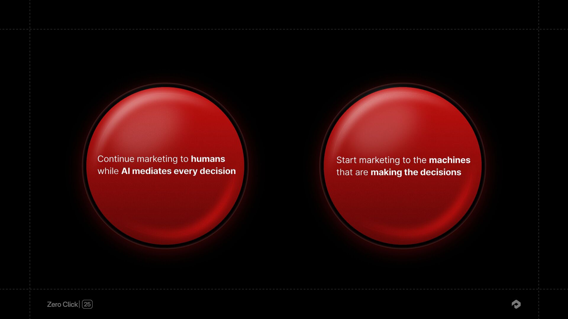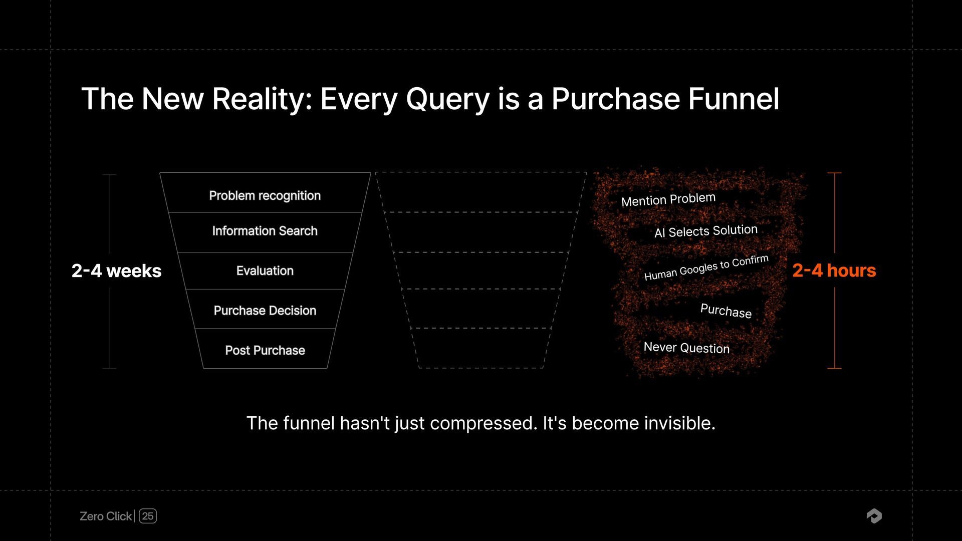 recognition Information Search Evaluation Purchase Decision Post Purchase Mention Problem AI Selects Solution Human Googles to Confirm Purchase Never Question 2-4 weeks 2-4 hours The funnel hasn't just compressed. It's become invisible.