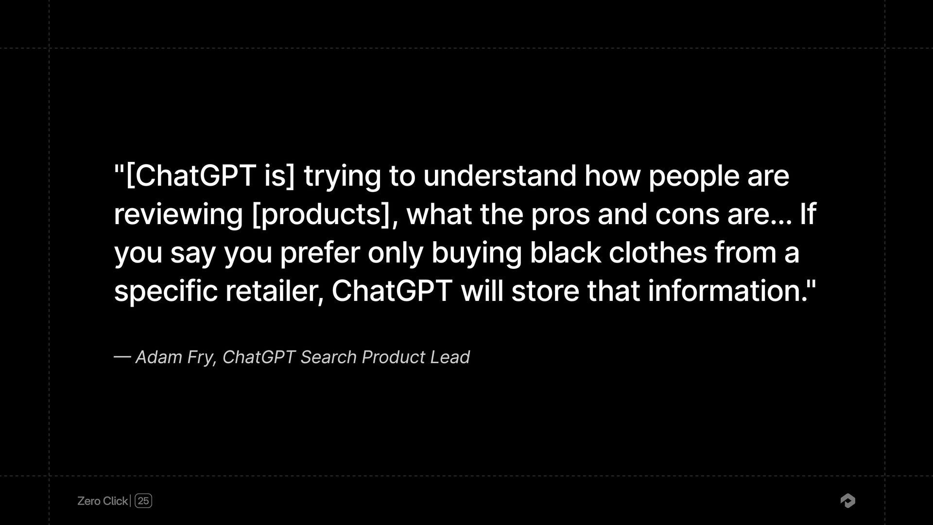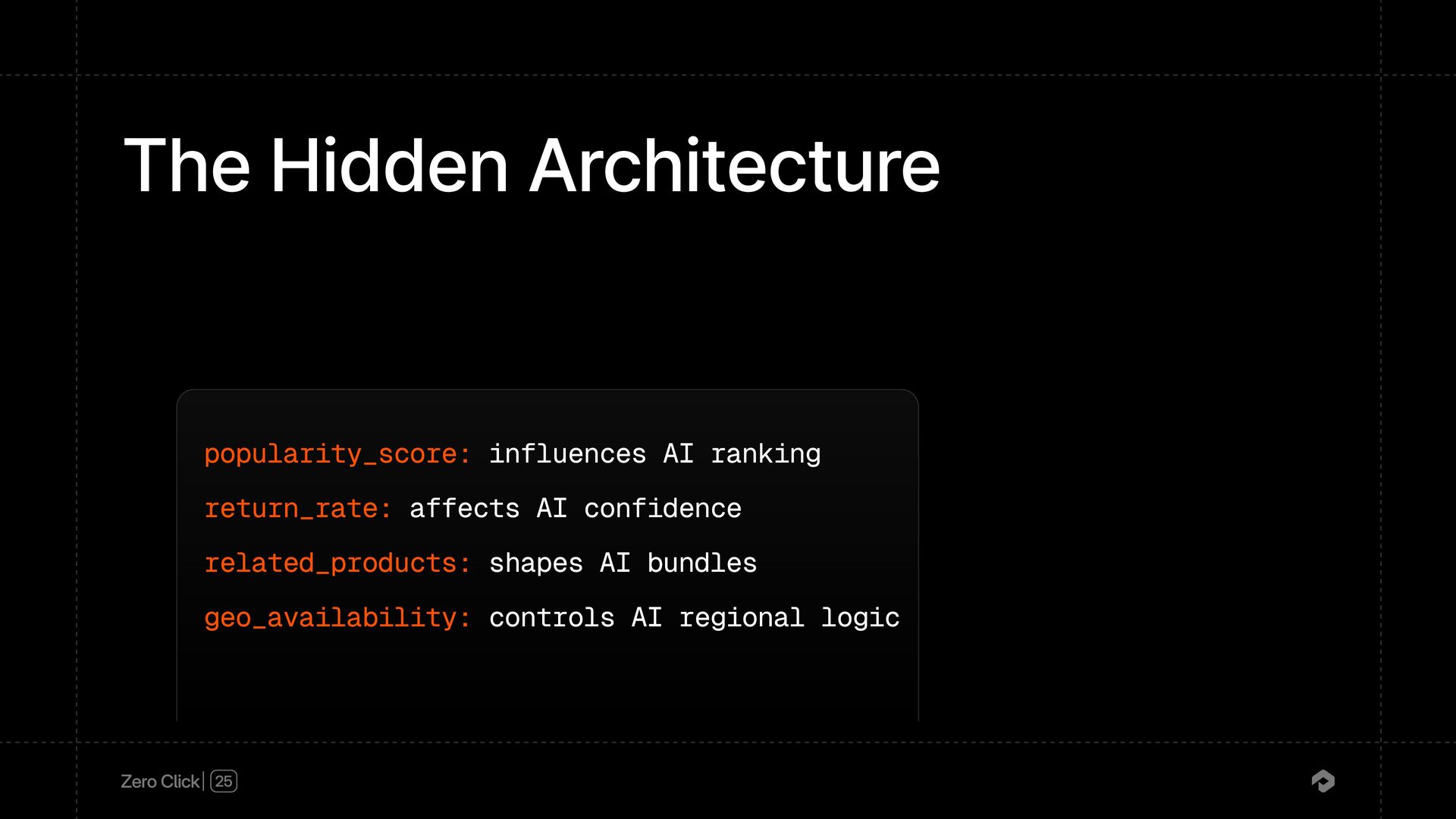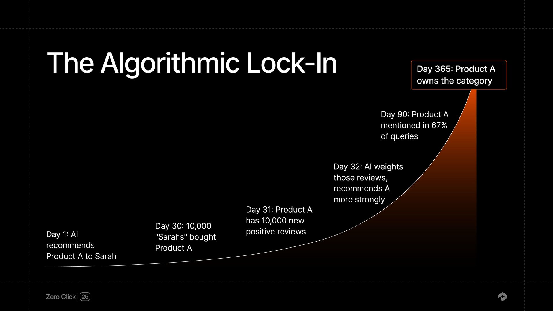 Sarah Day 30: 10,000 "Sarahs" bought Product A Day 31: Product A has 10,000 new positive reviews Day 32: AI weights those reviews, recommends A more strongly Day 90: Product A mentioned in 67% of queries Day 365: Product A owns the category