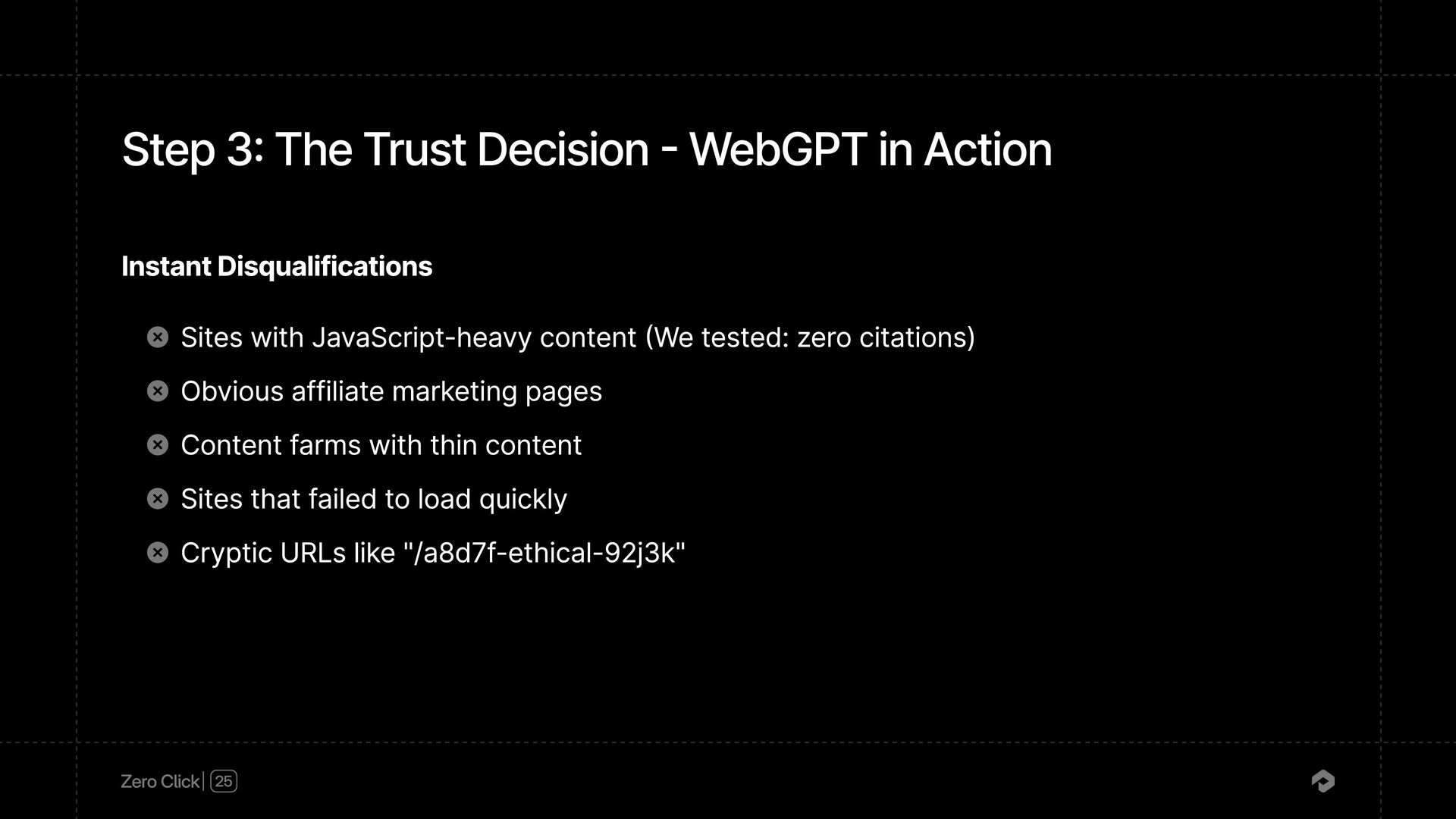 Action Sites with JavaScript-heavy content (We tested: zero citations) Obvious affiliate marketing pages Content farms with thin content Sites that failed to load quickly Cryptic URLs like "/a8d7f-ethical-92j3k"