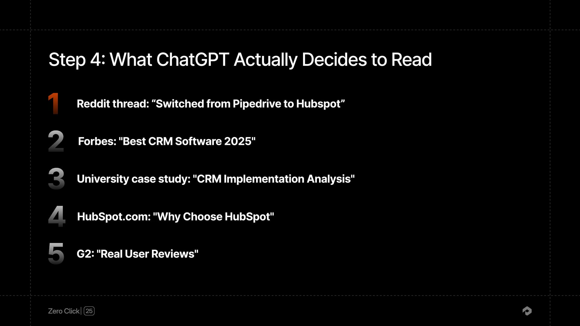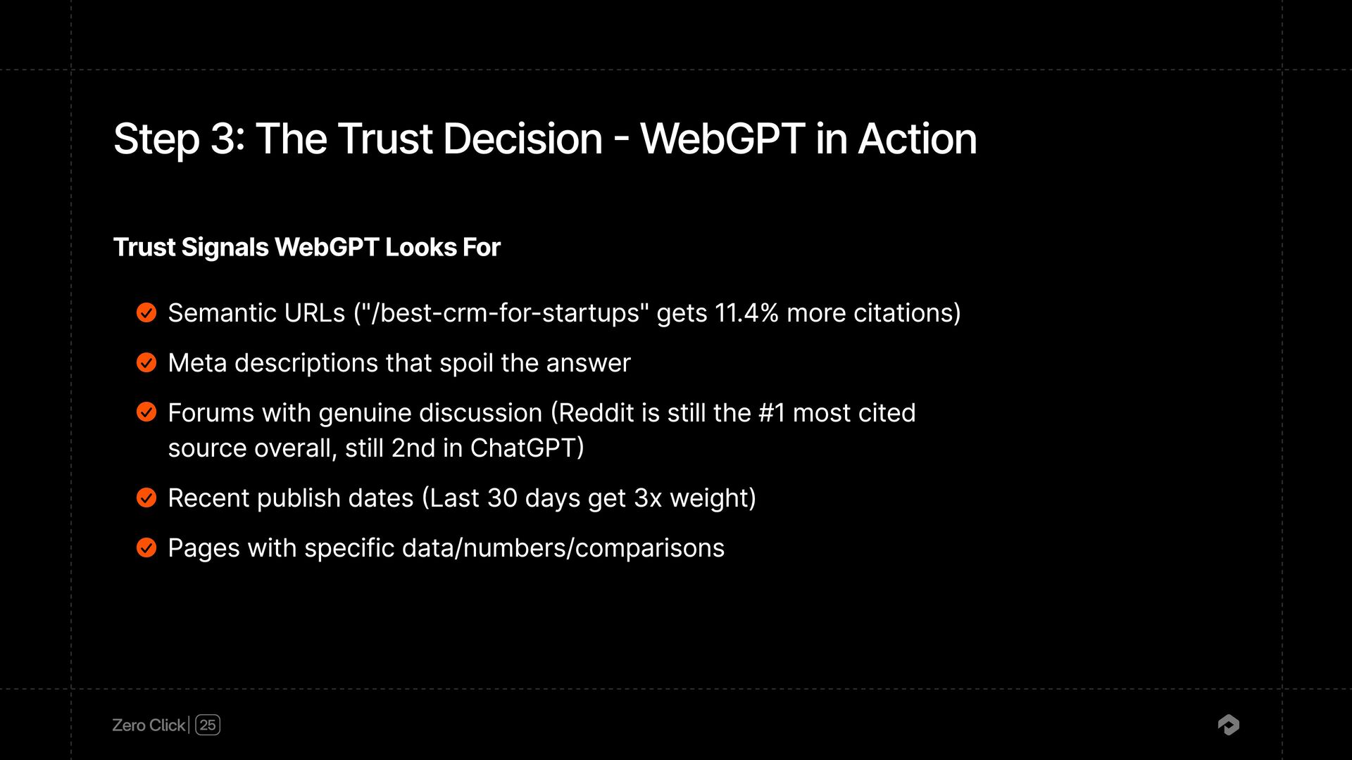 more citations) Meta descriptions that spoil the answer Forums with genuine discussion (Reddit is still the #1 most cited source overall, still 2nd in ChatGPT) Recent publish dates (Last 30 days get 3x weight) Pages with specific data/numbers/comparisons Step 3: The Trust Decision - WebGPT in Action