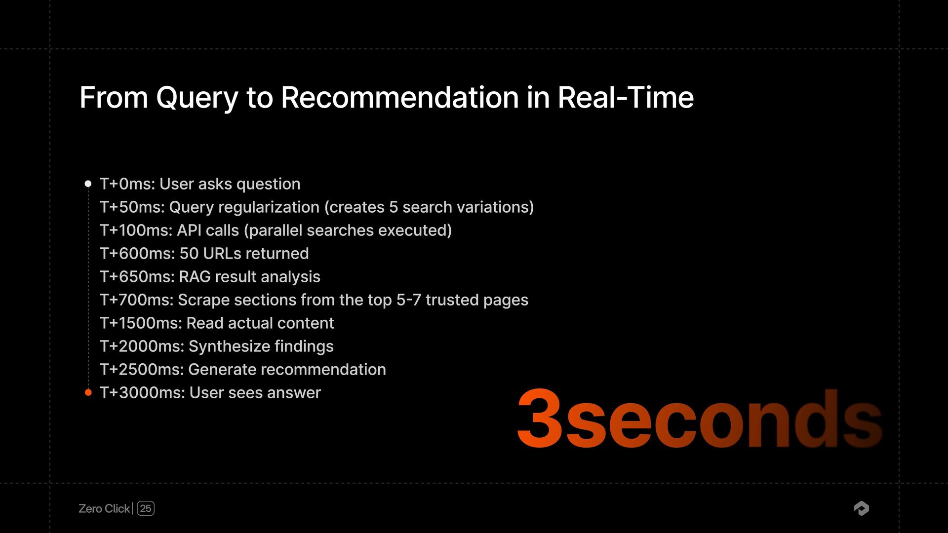 T+50ms: Query regularization (creates 5 search variations) T+100ms: API calls (parallel searches executed) T+600ms: 50 URLs returned T+650ms: RAG result analysis T+700ms: Scrape sections from the top 5-7 trusted pages T+1500ms: Read actual content T+2000ms: Synthesize findings T+2500ms: Generate recommendation T+3000ms: User sees answer