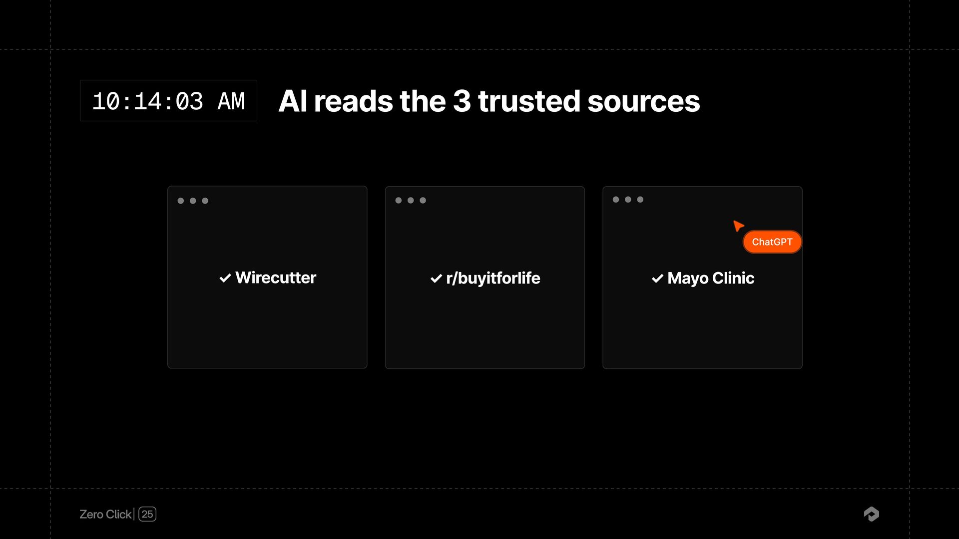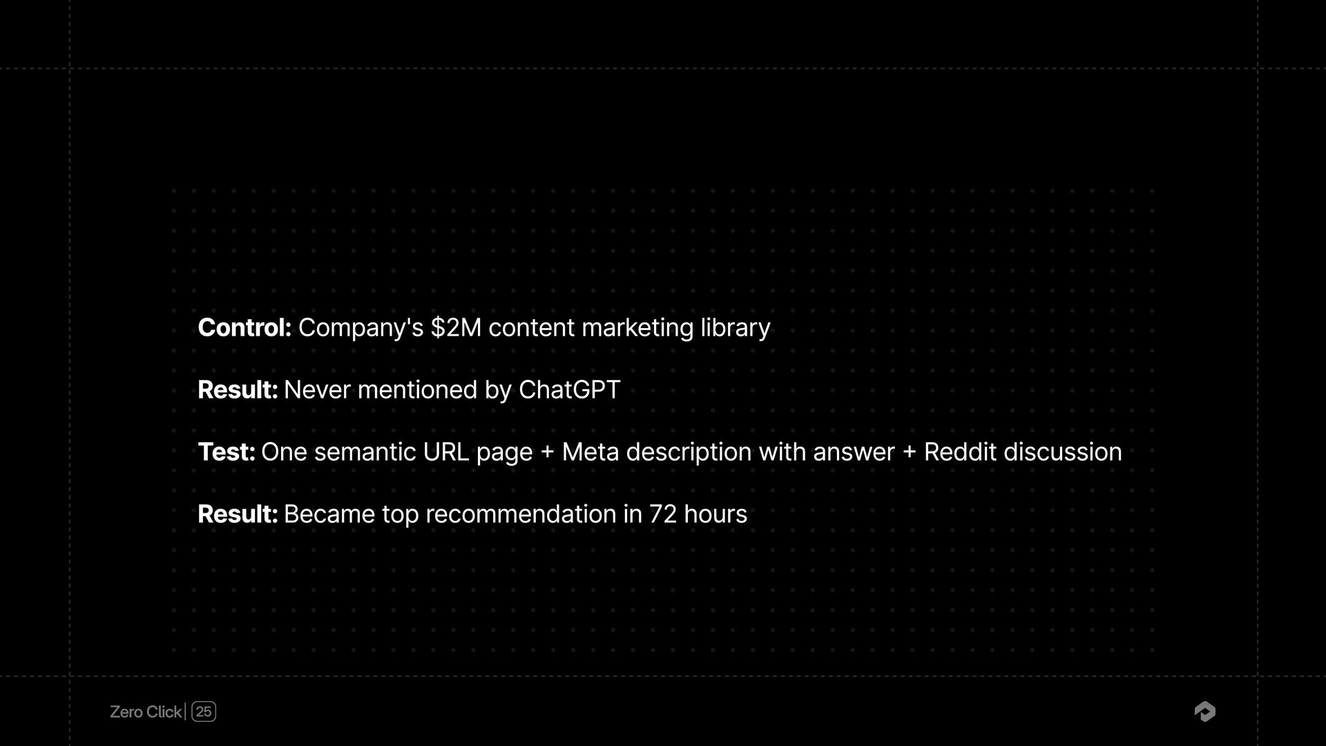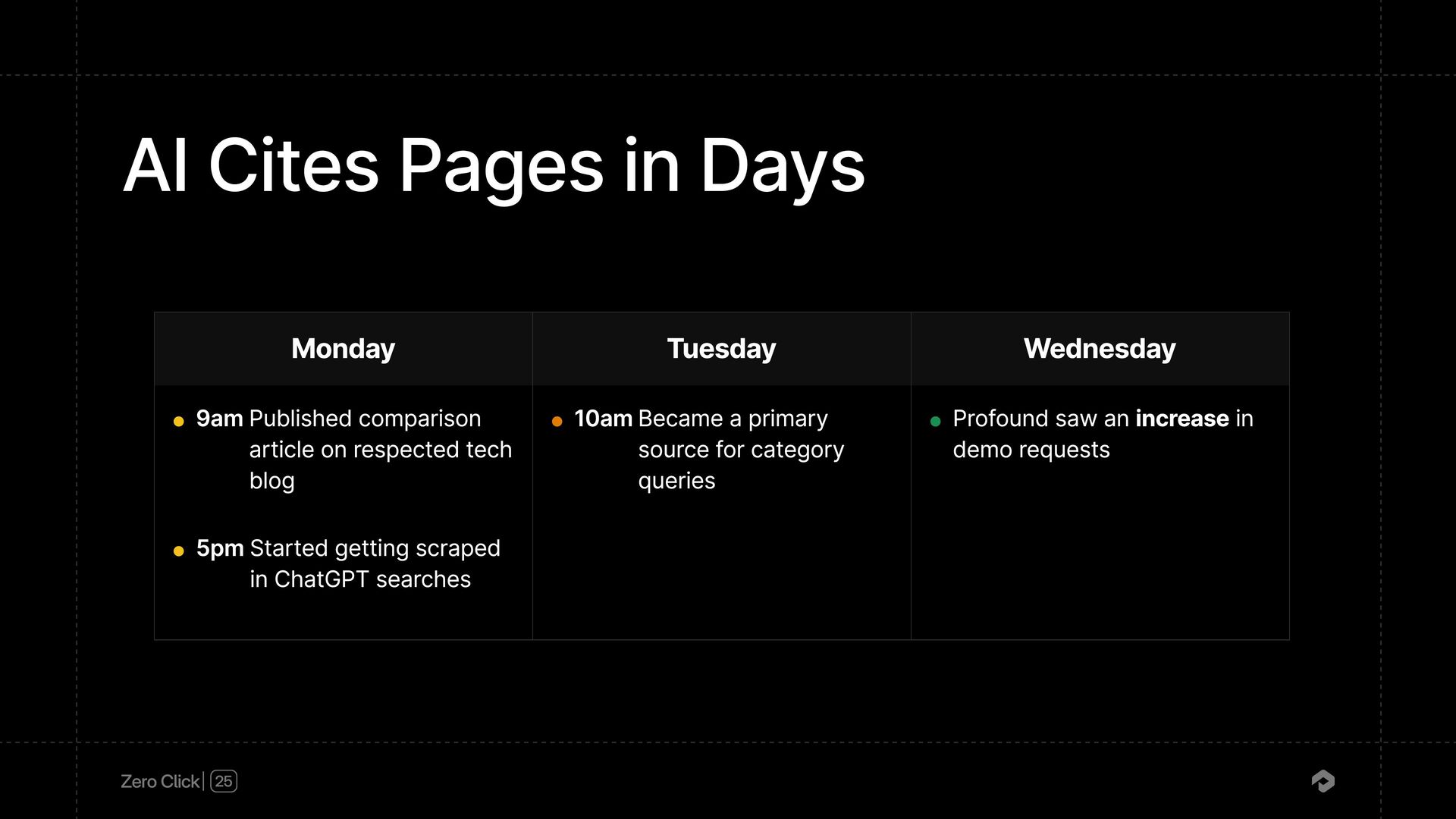 on respected tech blog 5pm Started getting scraped in ChatGPT searches Tuesday 10am Became a primary source for category queries Wednesday Profound saw an increase in demo requests