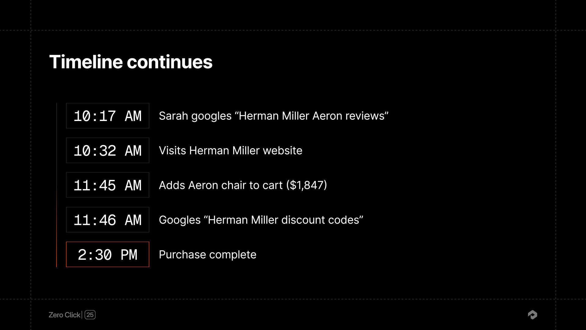 Timeline continues Sarah googles “Herman Miller Aeron reviews” Visits Herman Miller website Adds Aeron chair to cart ($1,847) Googles “Herman Miller discount codes” Purchase complete
