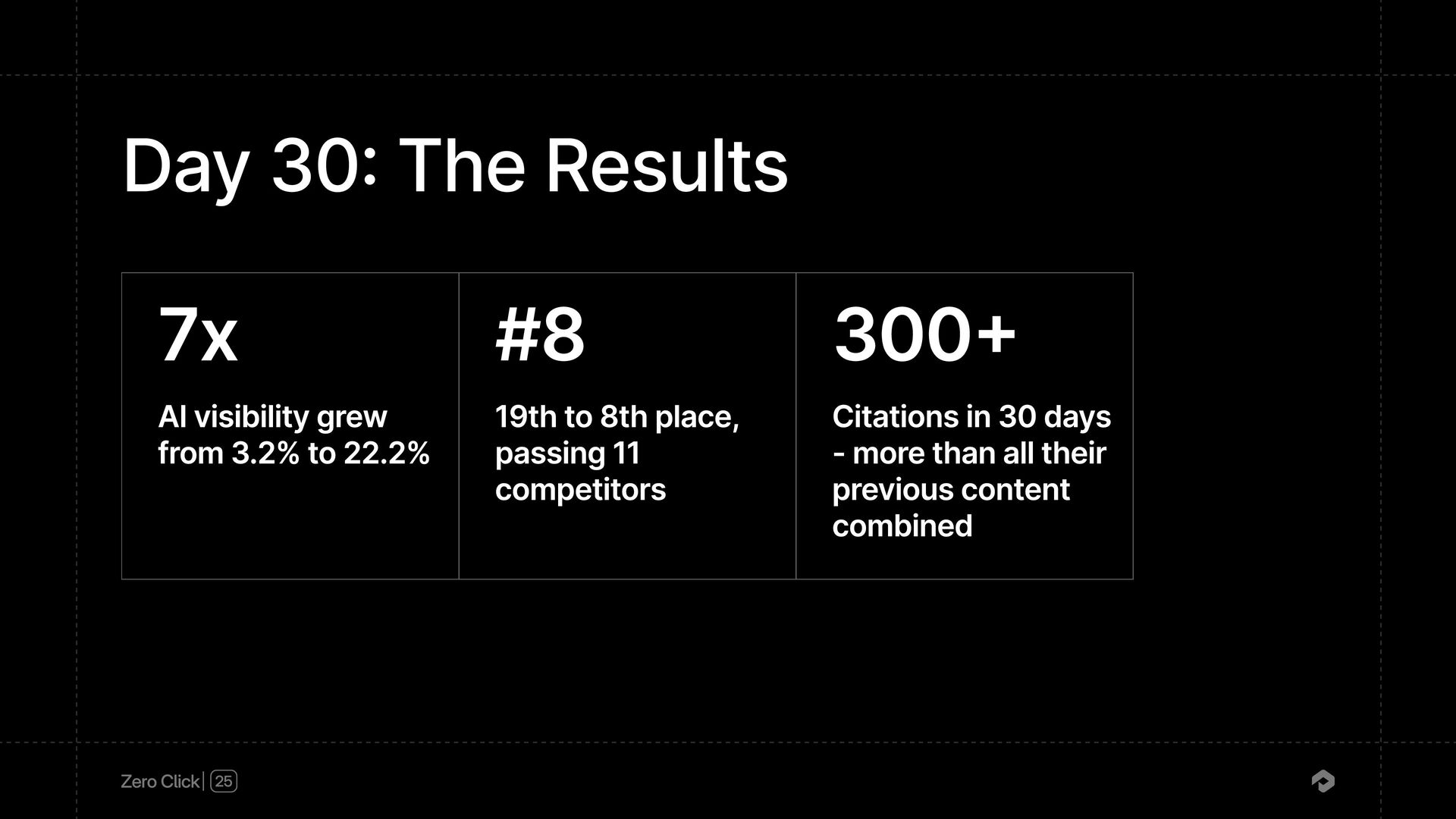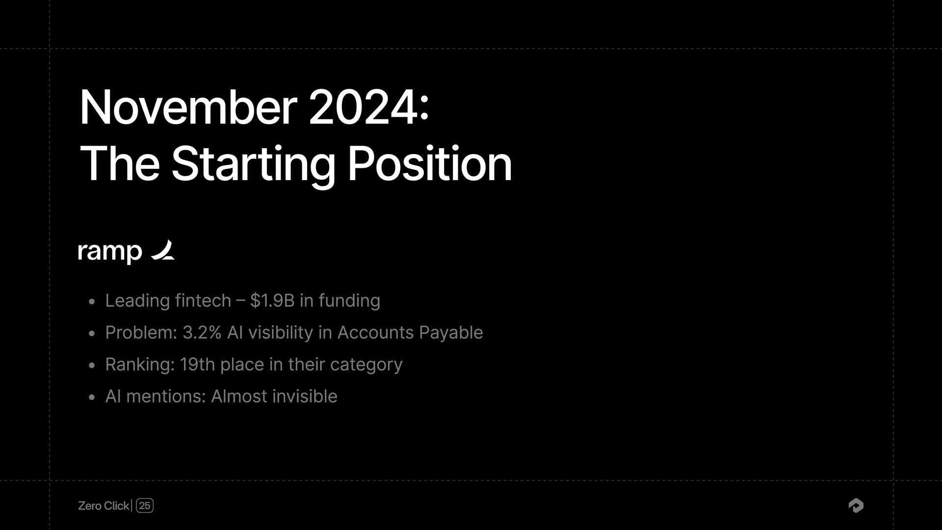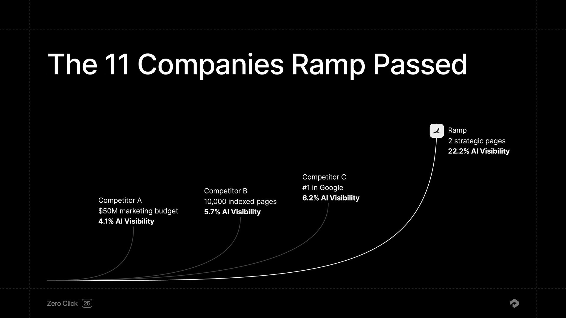 10,000 indexed pages 5.7% AI Visibility Competitor C #1 in Google 6.2% AI Visibility Ramp 2 strategic pages 22.2% AI Visibility The 11 Companies Ramp Passed