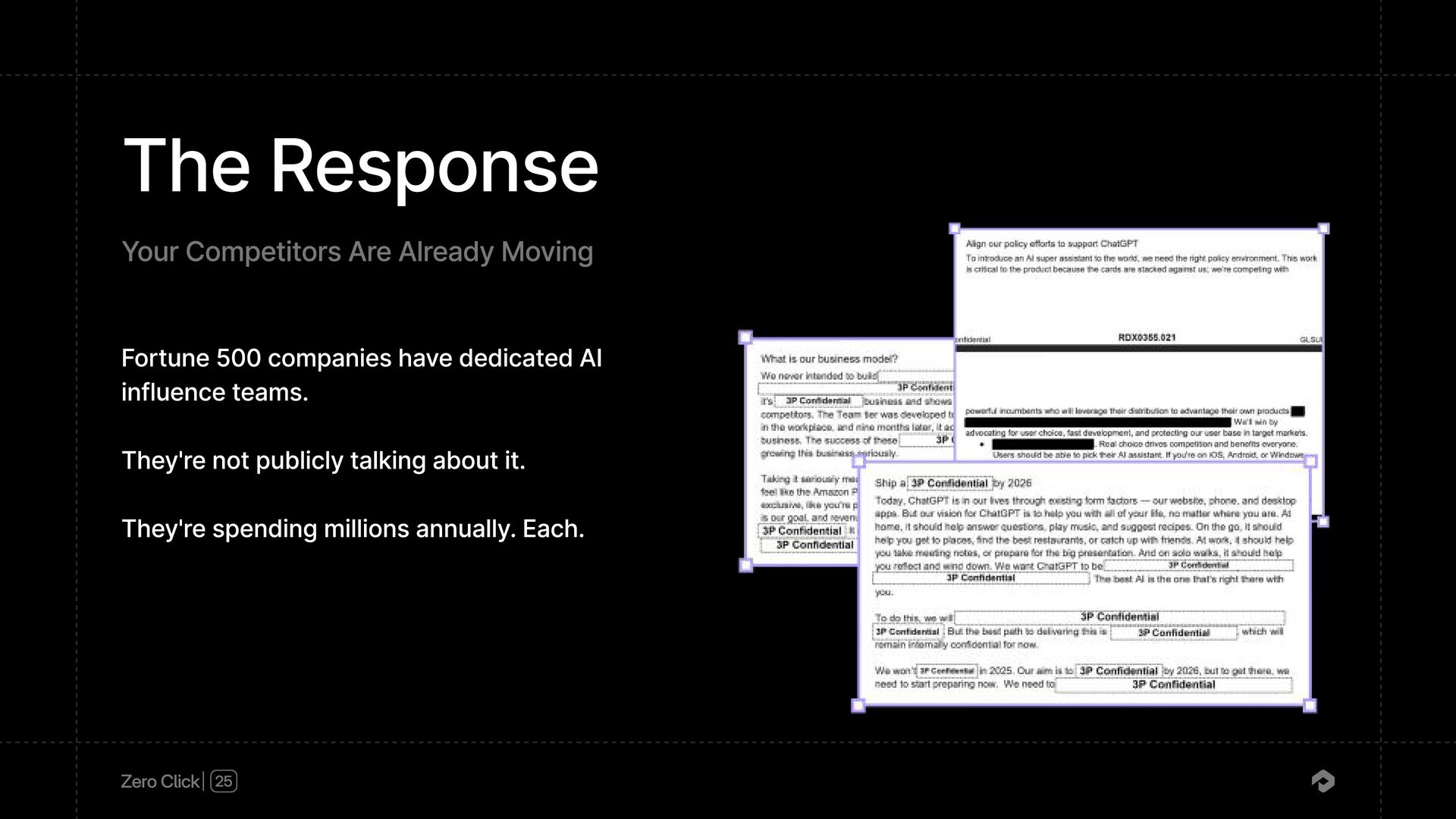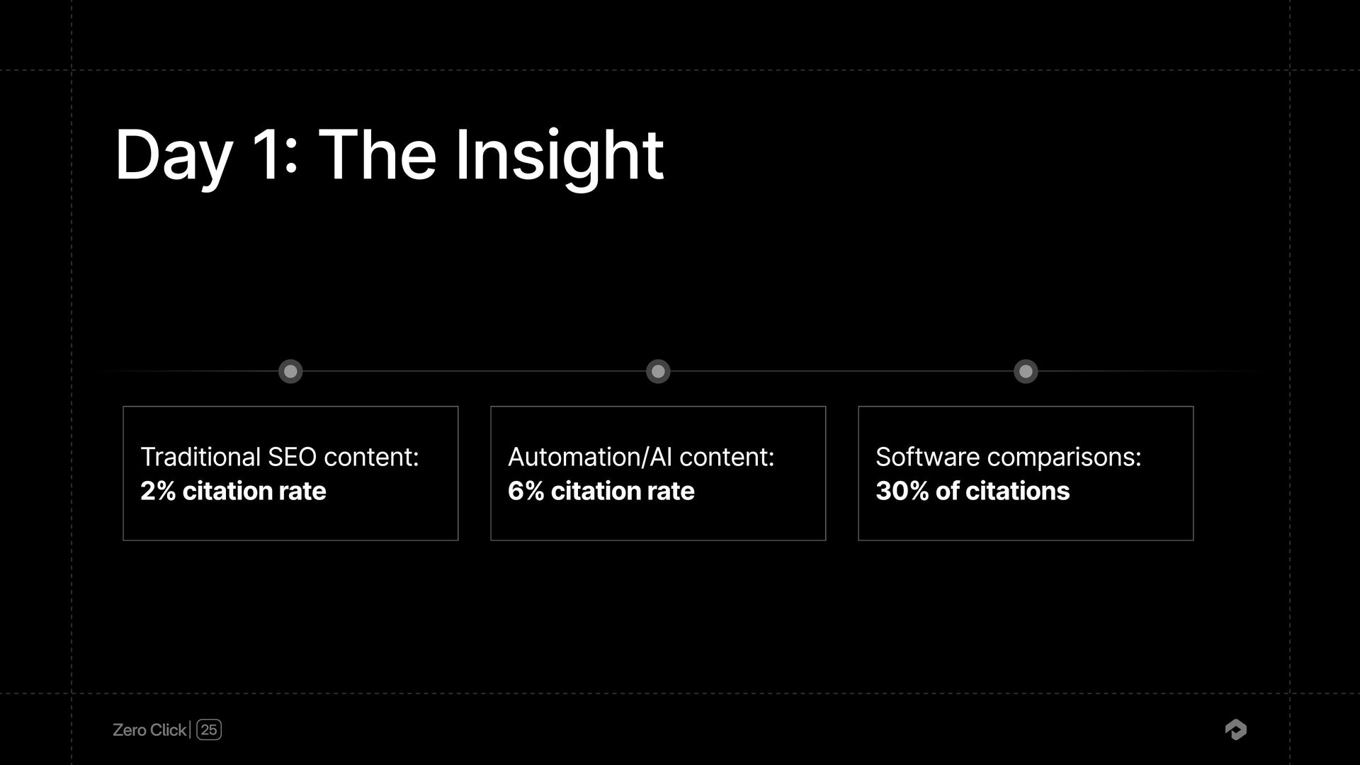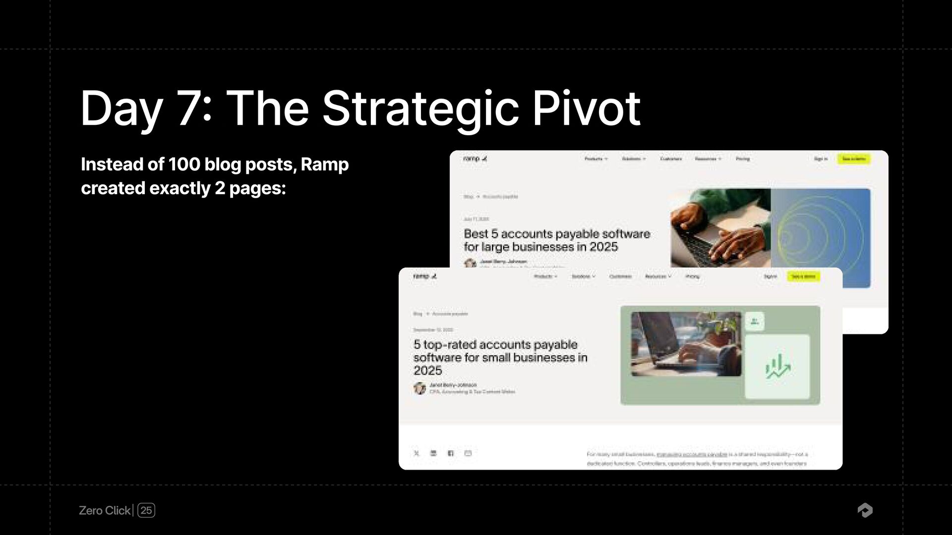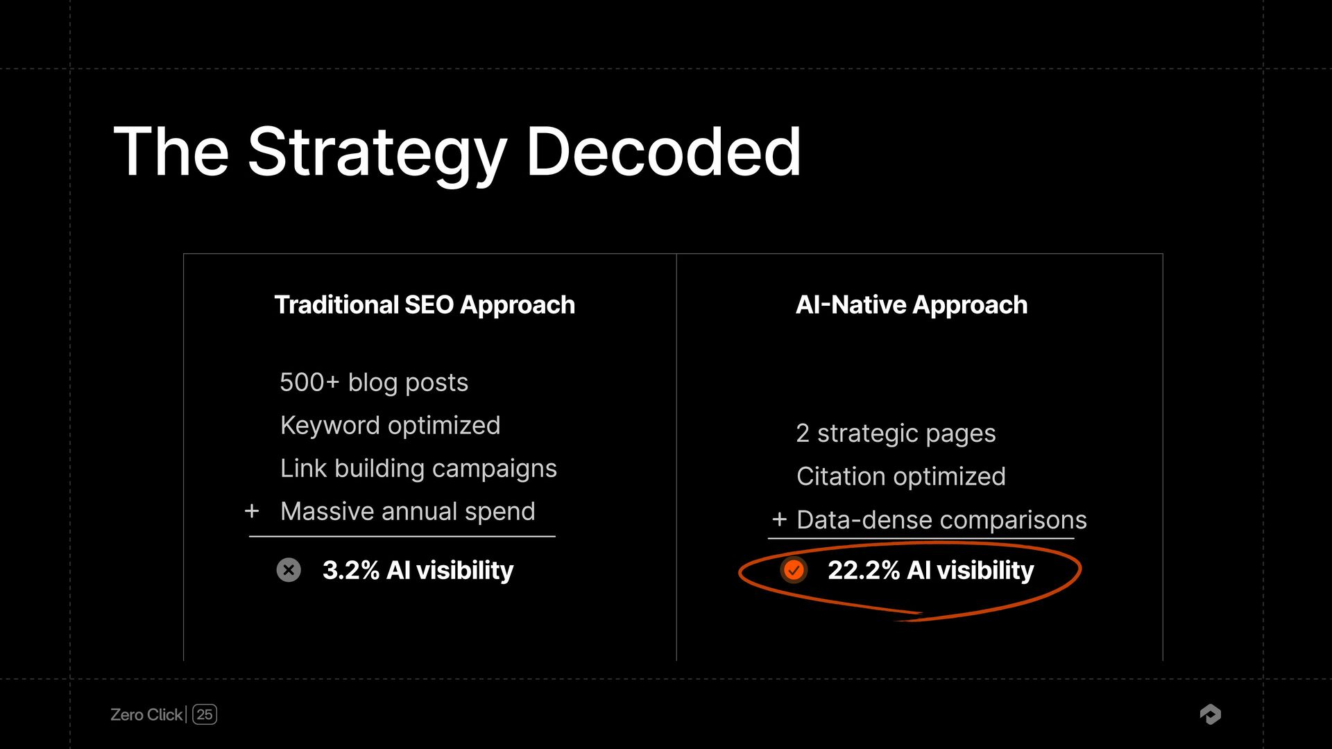 10,000 indexed pages 5.7% AI Visibility Competitor C #1 in Google 6.2% AI Visibility Ramp 2 strategic pages 22.2% AI Visibility The 11 Companies Ramp Passed