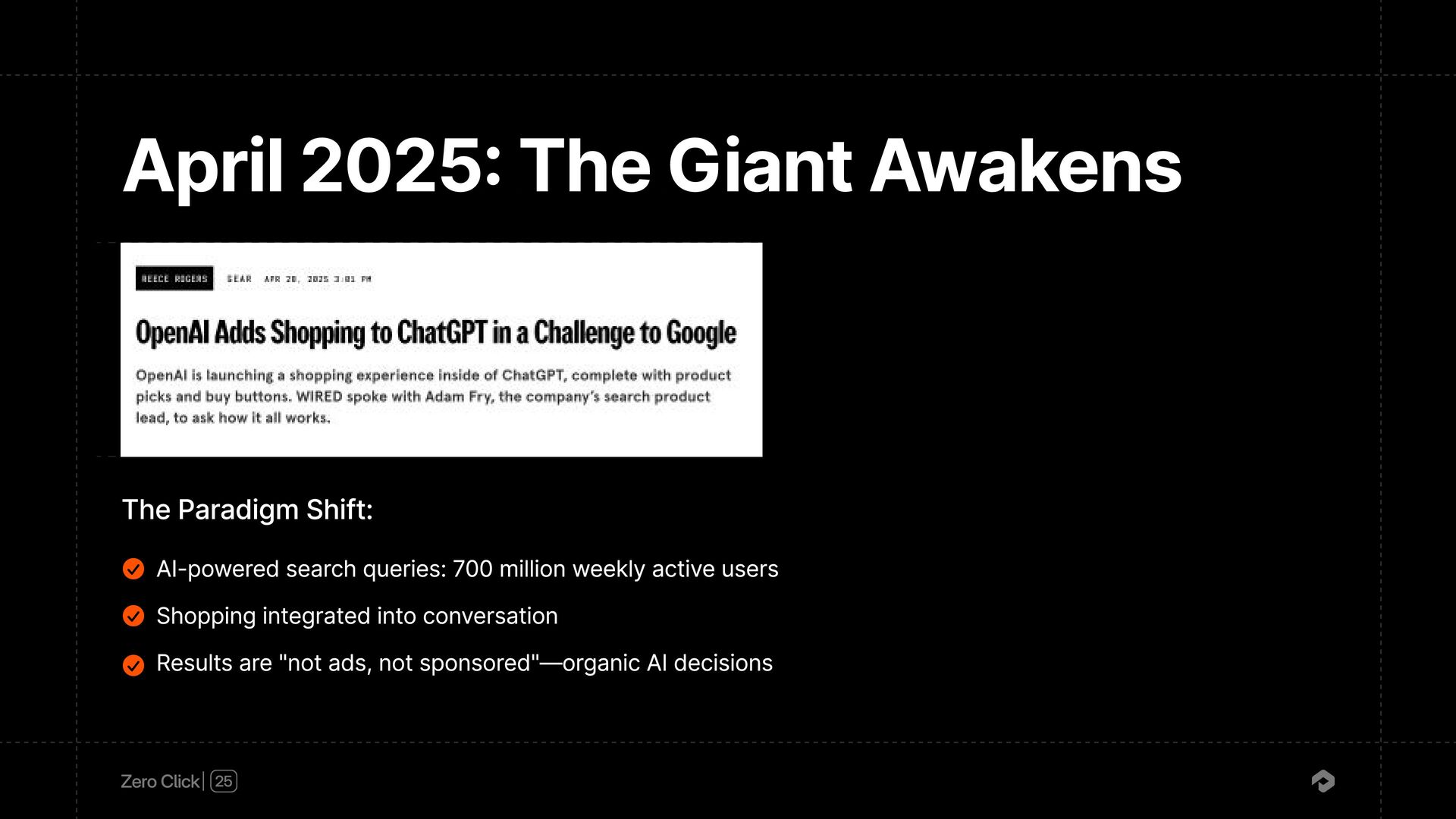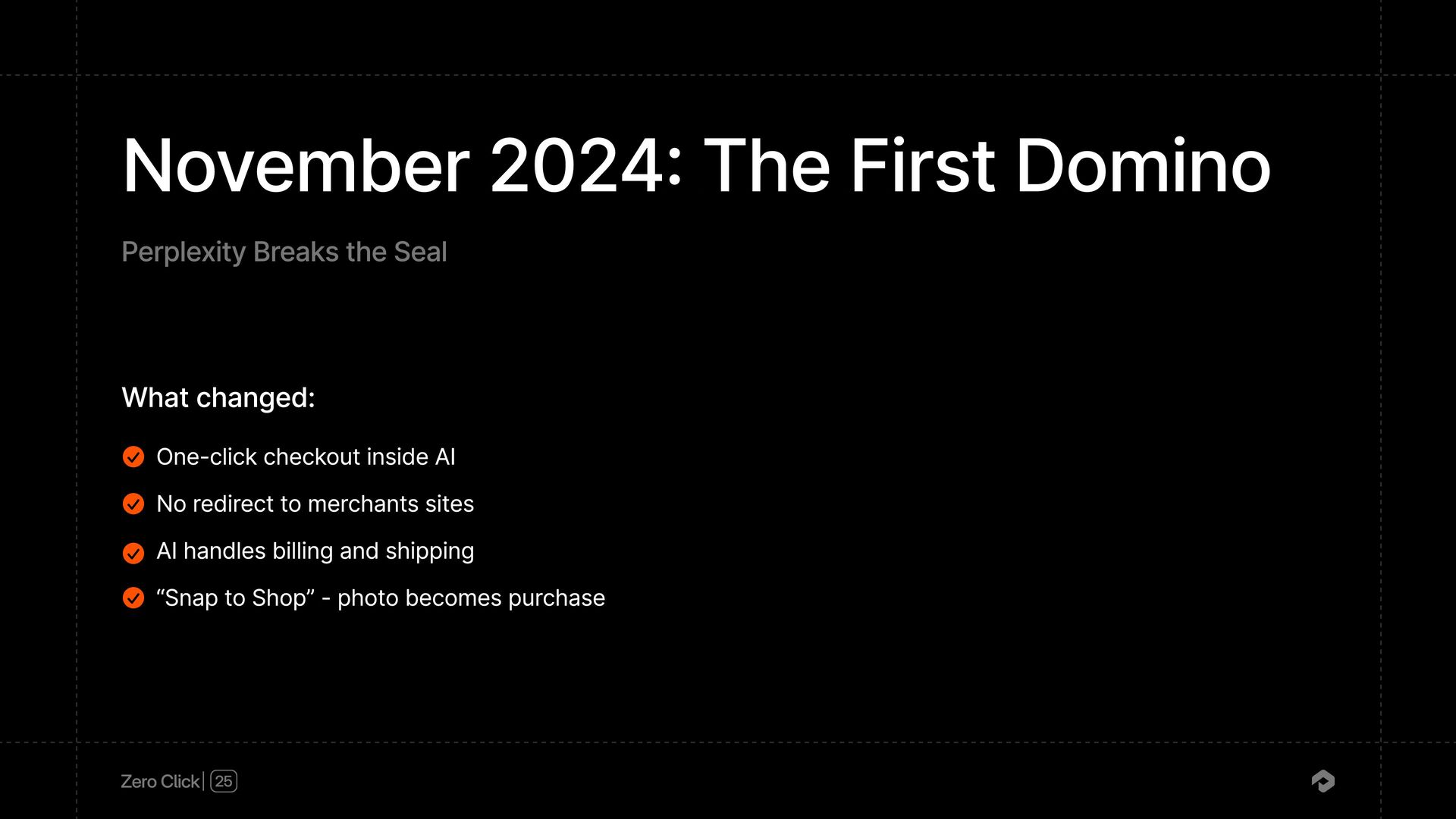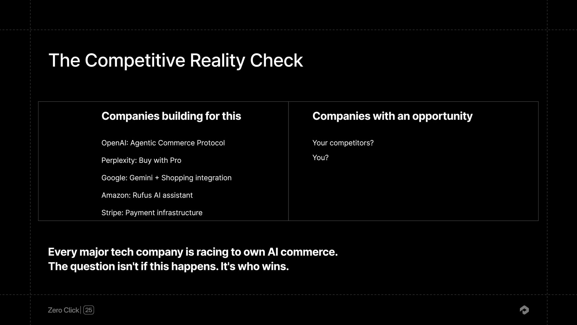 to own AI commerce. The question isn't if this happens. It's who wins. Companies building for this OpenAI: Agentic Commerce Protocol Perplexity: Buy with Pro Google: Gemini + Shopping integration Amazon: Rufus AI assistant Stripe: Payment infrastructure Companies with an opportunity Your competitors? You?