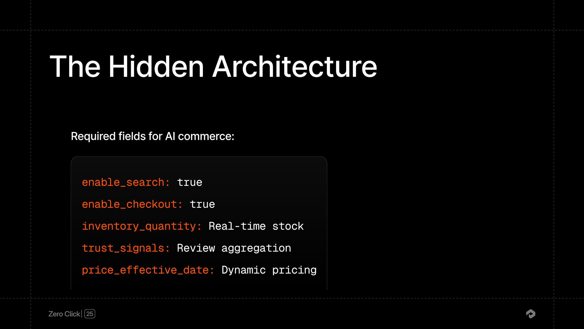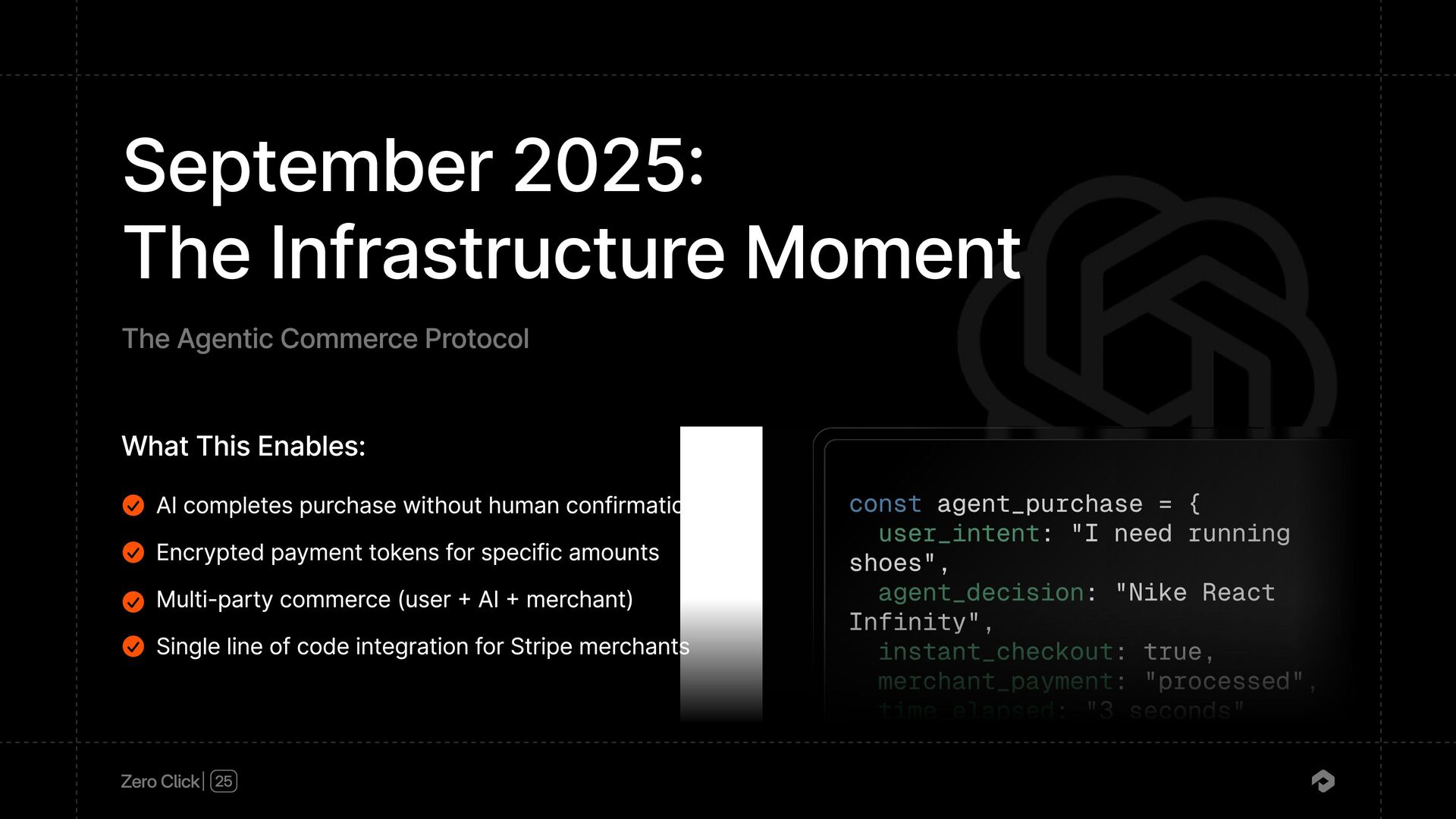 agent_purchase = { : "I need running shoes", : "Nike React Infinity", : true, : "processed", : "3 seconds" } user_intent agent_decision instant_checkout merchant_payment time_elapsed “url”: “AcmeB2B”, } What This Enables: AI completes purchase without human confirmation Encrypted payment tokens for specific amounts Multi-party commerce (user + AI + merchant) Single line of code integration for Stripe merchants